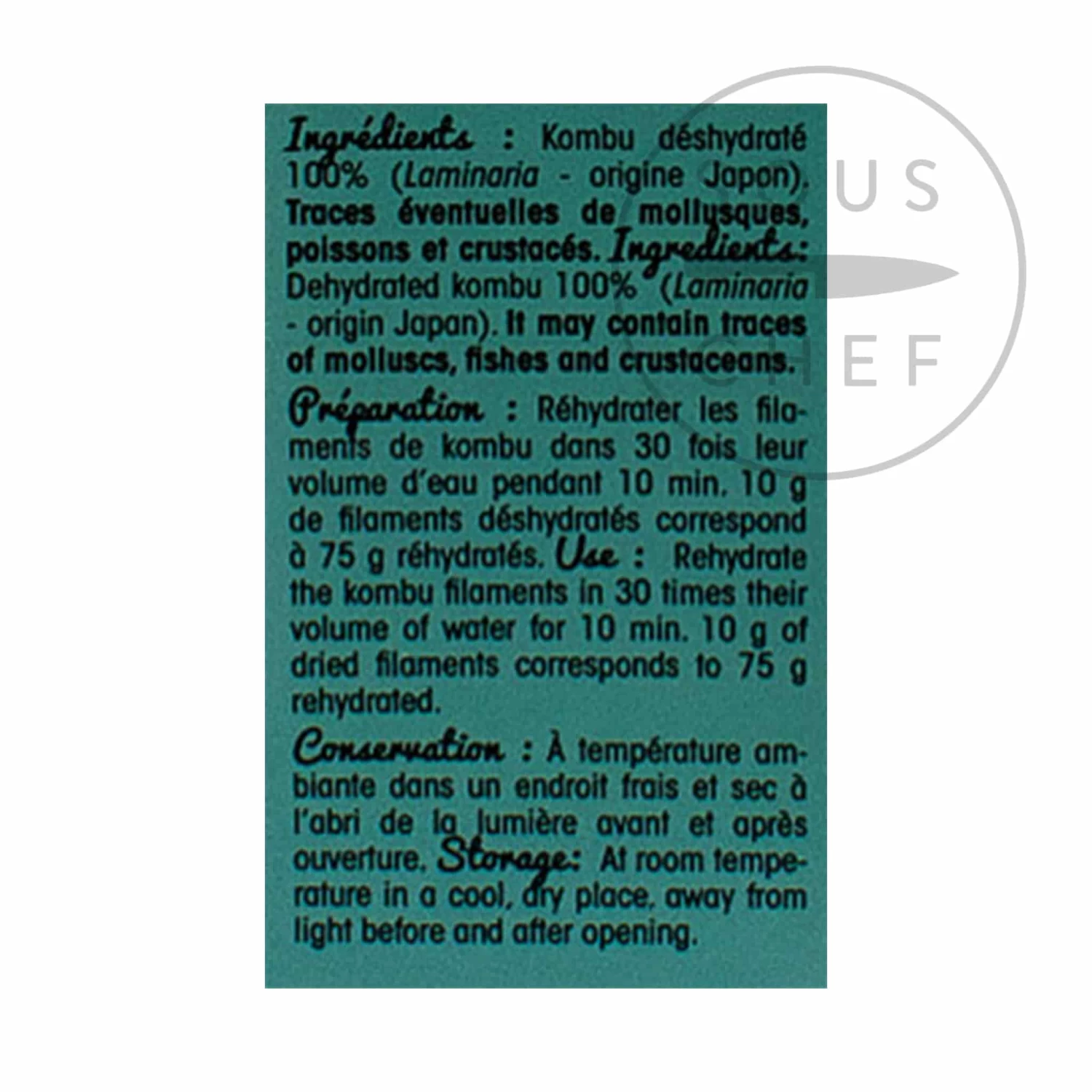 Usage: Rehydrate the filaments in 30 times their volume in water. 10g of dried kombu equals 75g of rehydrated seaweed. Â