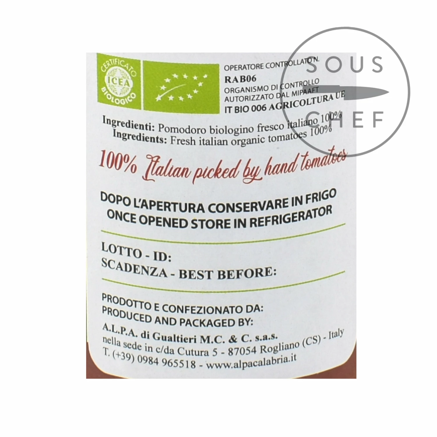 Ingredients: fresh Italian organic tomatoes (100%).