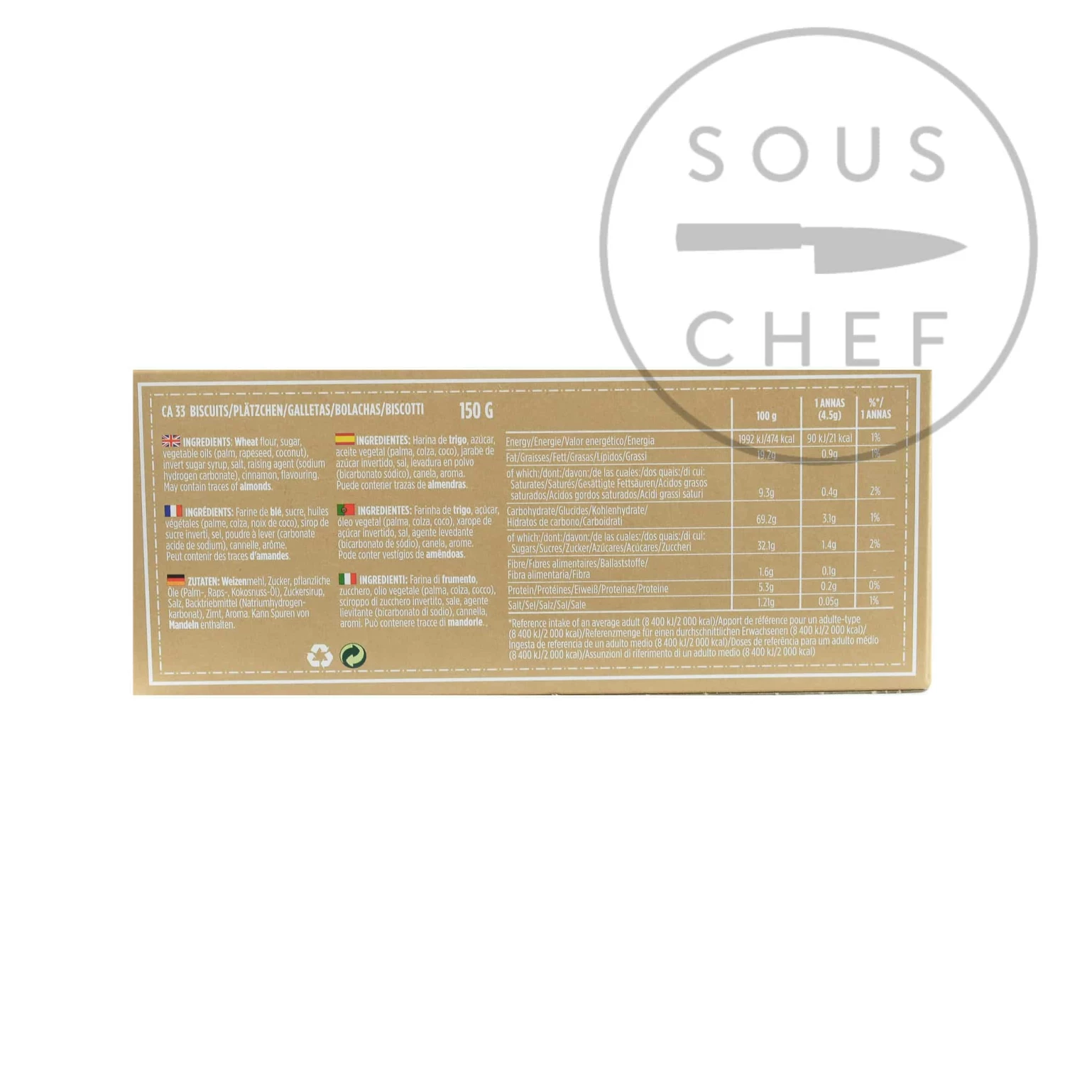 Ingredients: wheat flour, sugar, vegetable oils (alm, rapeseed, coconut), invert syrup, salt, raising agent (sodium hydrogen carbonate), cinnamon, flavouring.Â