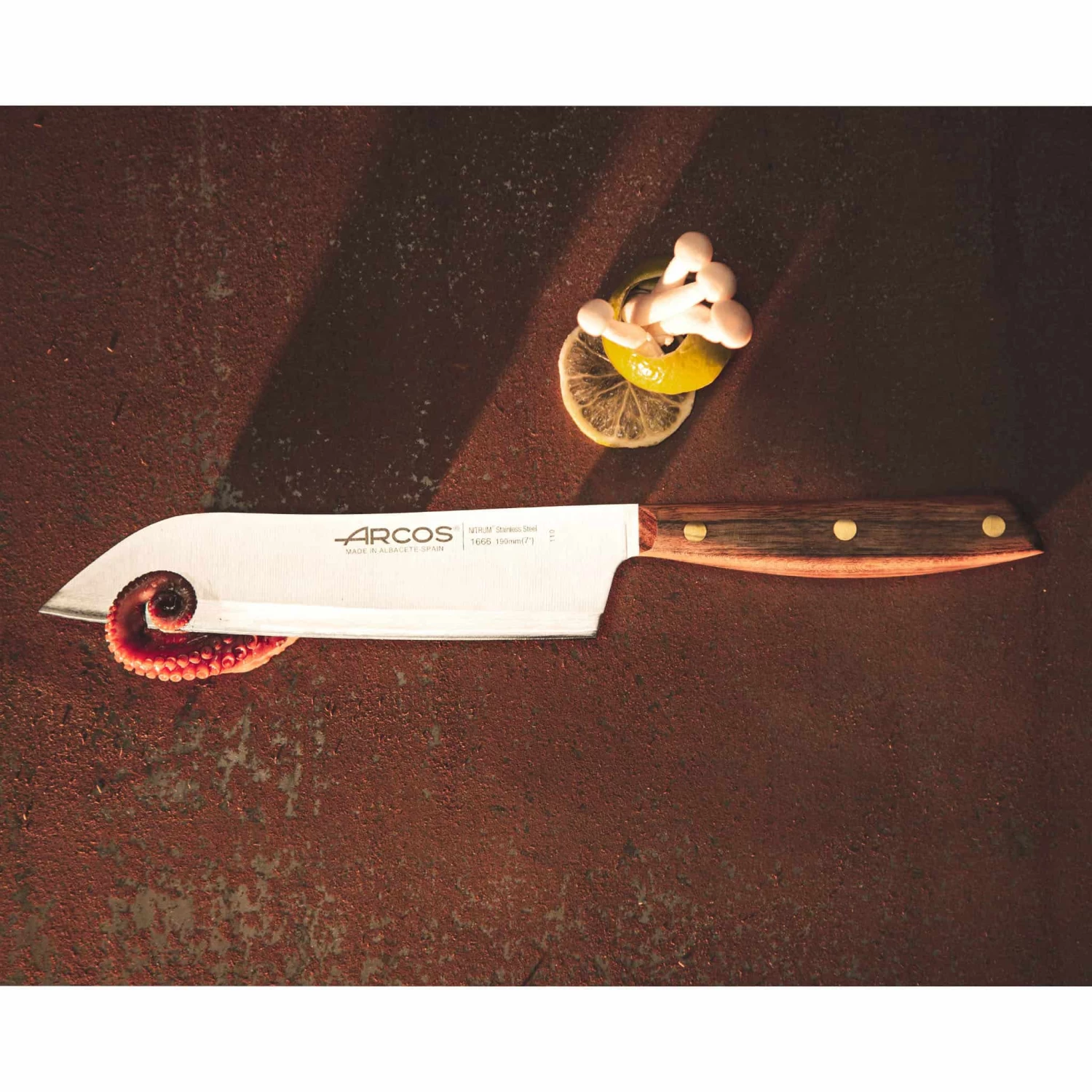 The straighter blade makes an up-and-down chopping motion rather than a more traditional rocking motion associated with a Western blade, which gives a more controlled yet powerful cut. Made from Nitrum stainless steel that has been uniquely formulated by Acros, the Santoku knife offers increased strength and hardness and holds its sharp, smooth edge for longer.Â