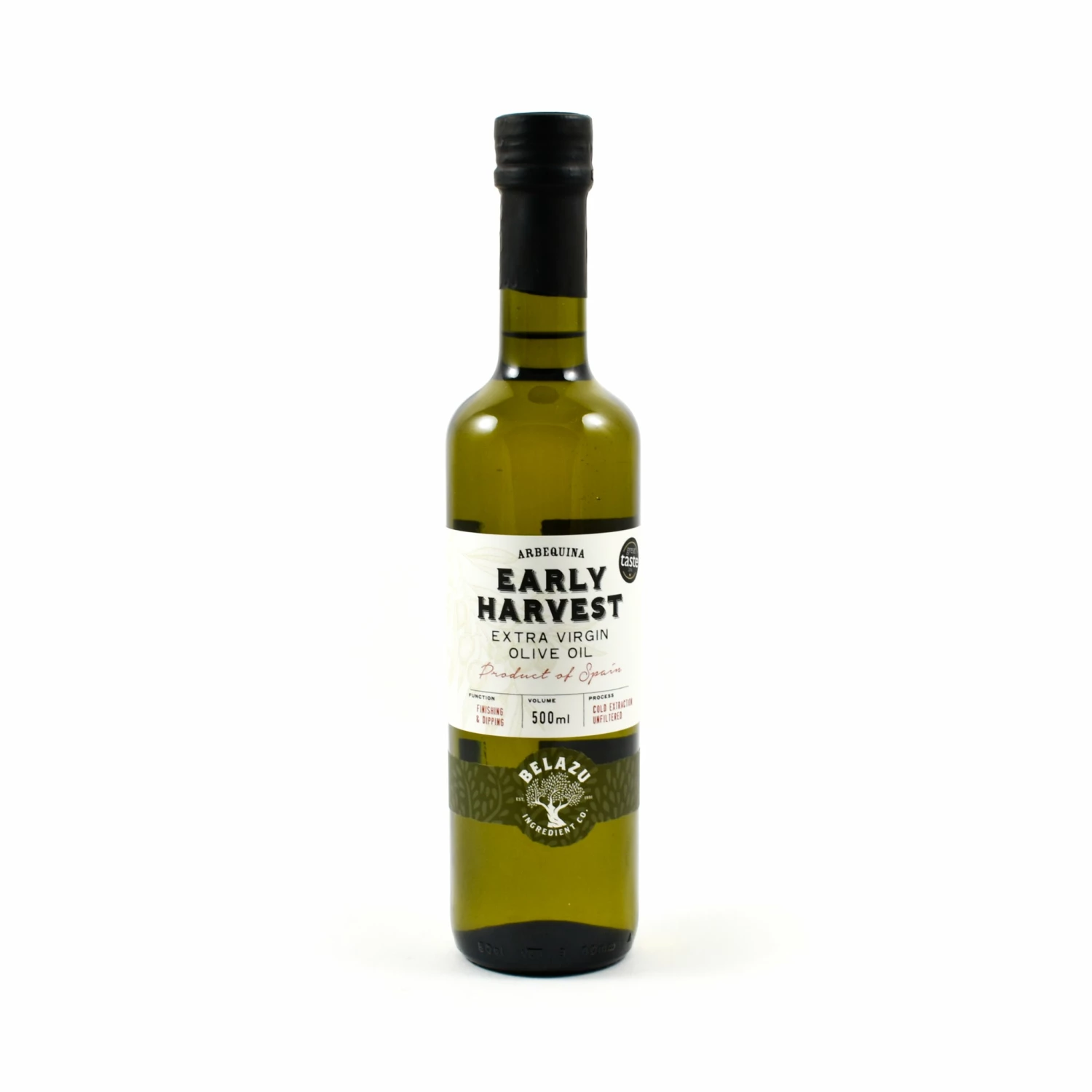 Belazu early harvest arbequina extra virgin olive oil is a very special finishing oil from Catalonia in Spain. It has a complex character, with fresh notes of grass and pepper and richer notes of almonds and even banana.