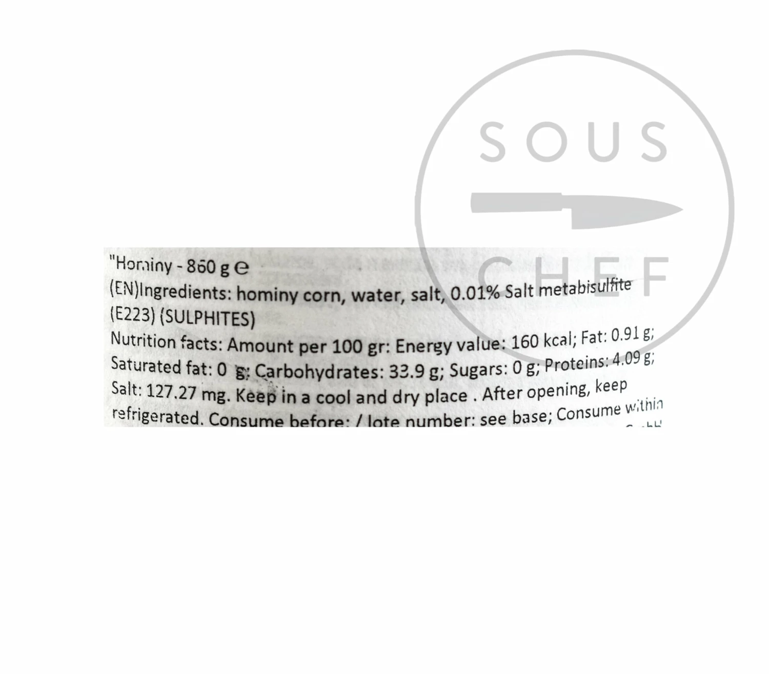 Ingredients: Hominy corn, water, salt, 0.01% salt metabisulfite (E223) (sulphites)
