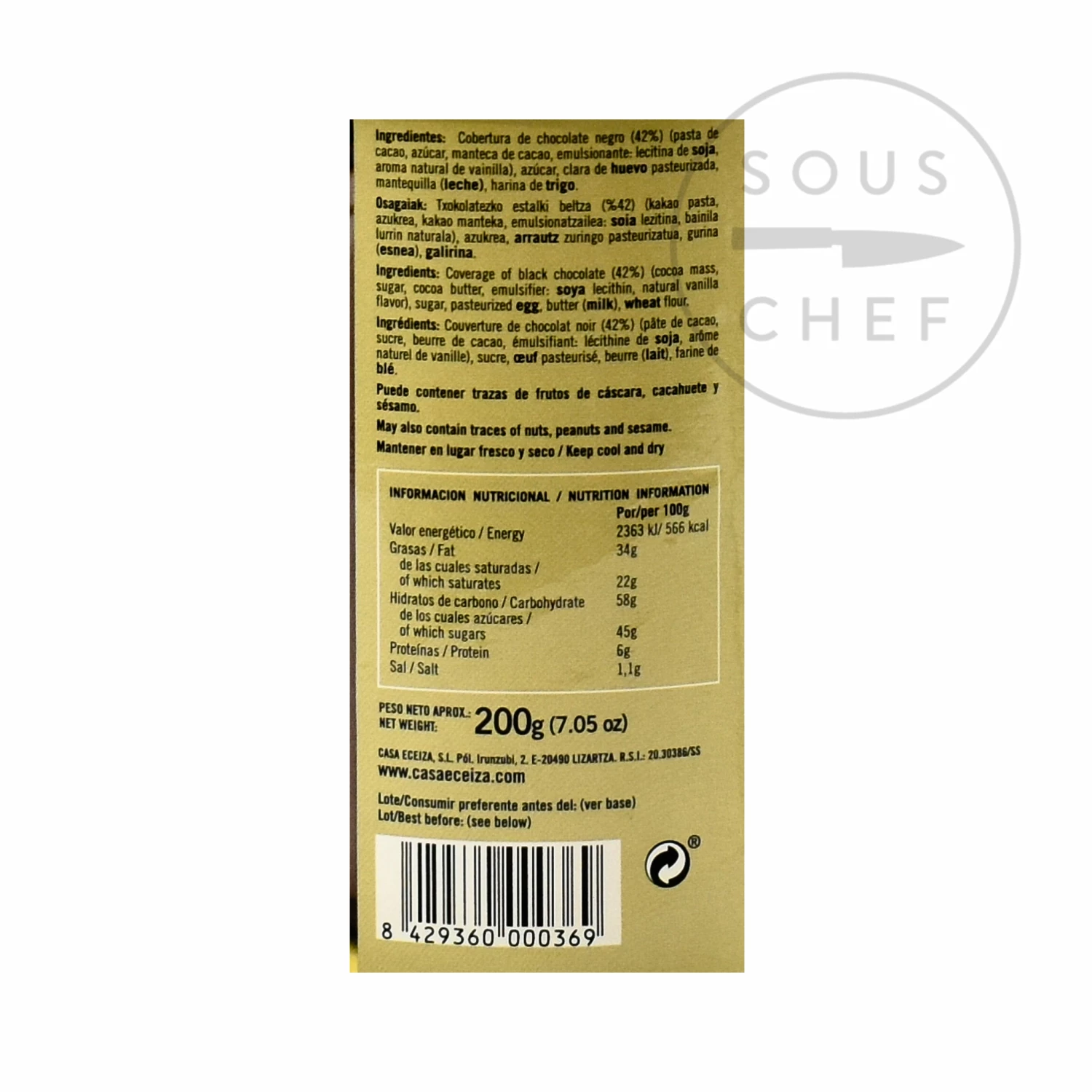 Ingredients: dark chocolate coating (42%) (cocoa mass, sugar, cocoa butter, emulsifier: soya lecithin, natural vanilla flavour), sugar, pasteurised egg, butter (milk), wheat (gluten) flour.