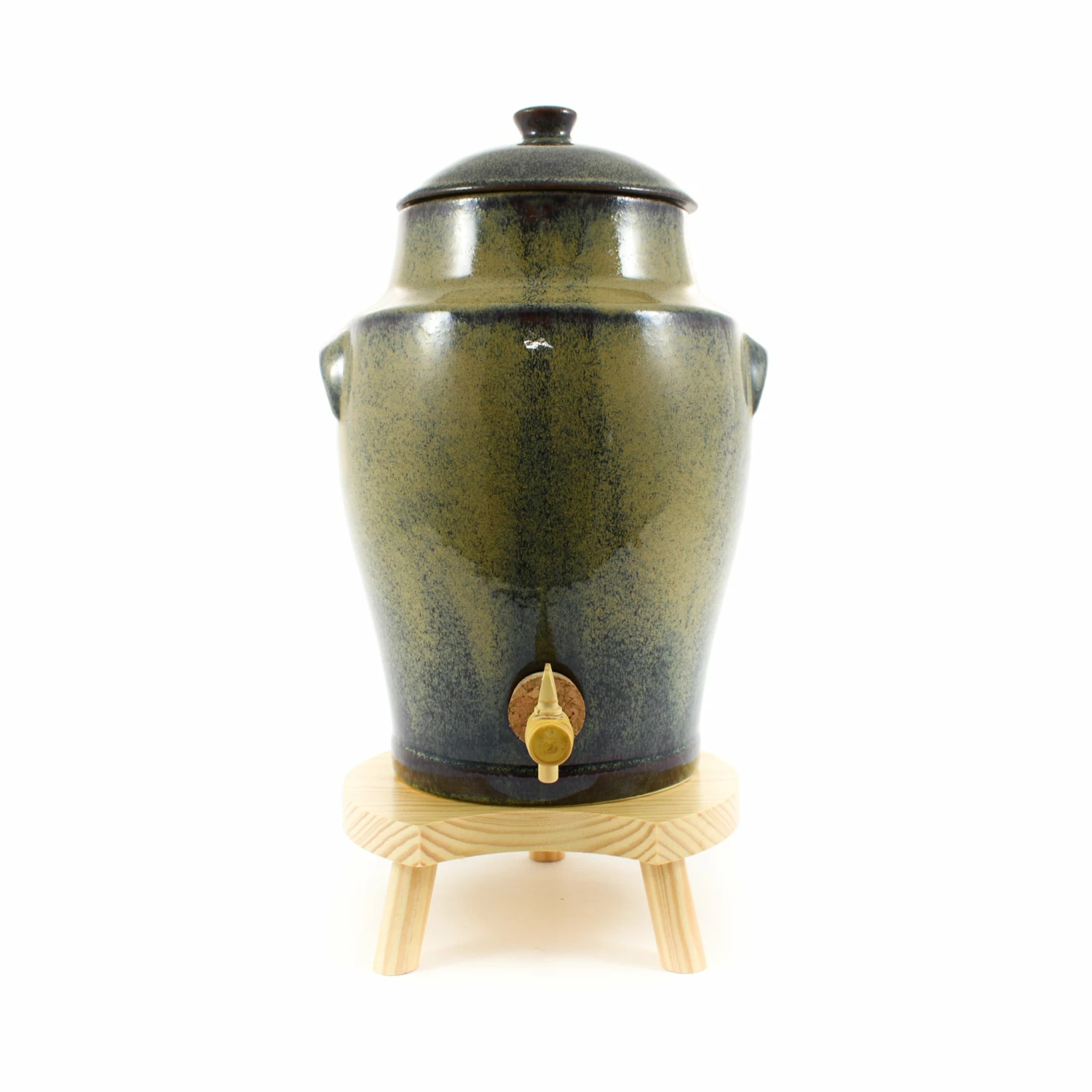 The hand-glazed traditional ‘amphora’ style vinaigrier echoes those that have been used all around the Mediterranean for hundreds of years. The curved section in the wooden stand makes it easy to fit a bottle, jar or cup under the tap.