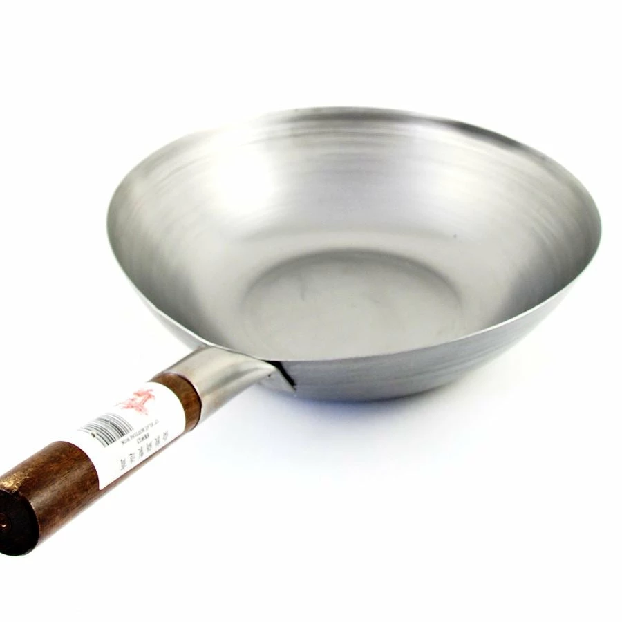 The carbon steel wok is protected by an anti-rust film. First boil water in the wok for 10-15 minutes to soften the film, then scour the pan. To season the pan, wipe the inside surface with cooking oil. Pour 5mm of oil into the pan, bring to a high temperature, and then when a smoky-haze appears remove it from the heat and wipe well with kitchen towel. This burns off any remaining coating. Now the pan is ready to use. Always ensure there is enough oil in the pan when using, and wipe with a paper towel after use. If the pan needs washing, ensure it is completely dried and lightly-oiled before storing.