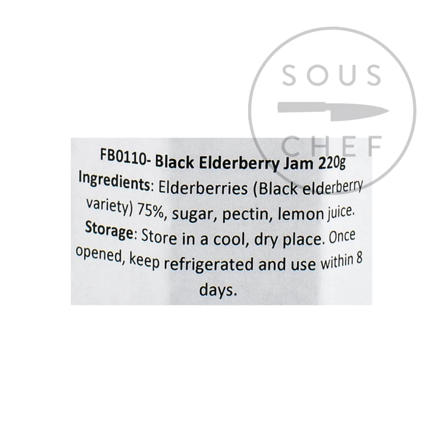 Ingredients: elderberries (black elderberry variety) 75%, sugar, pectin, lemon juice.