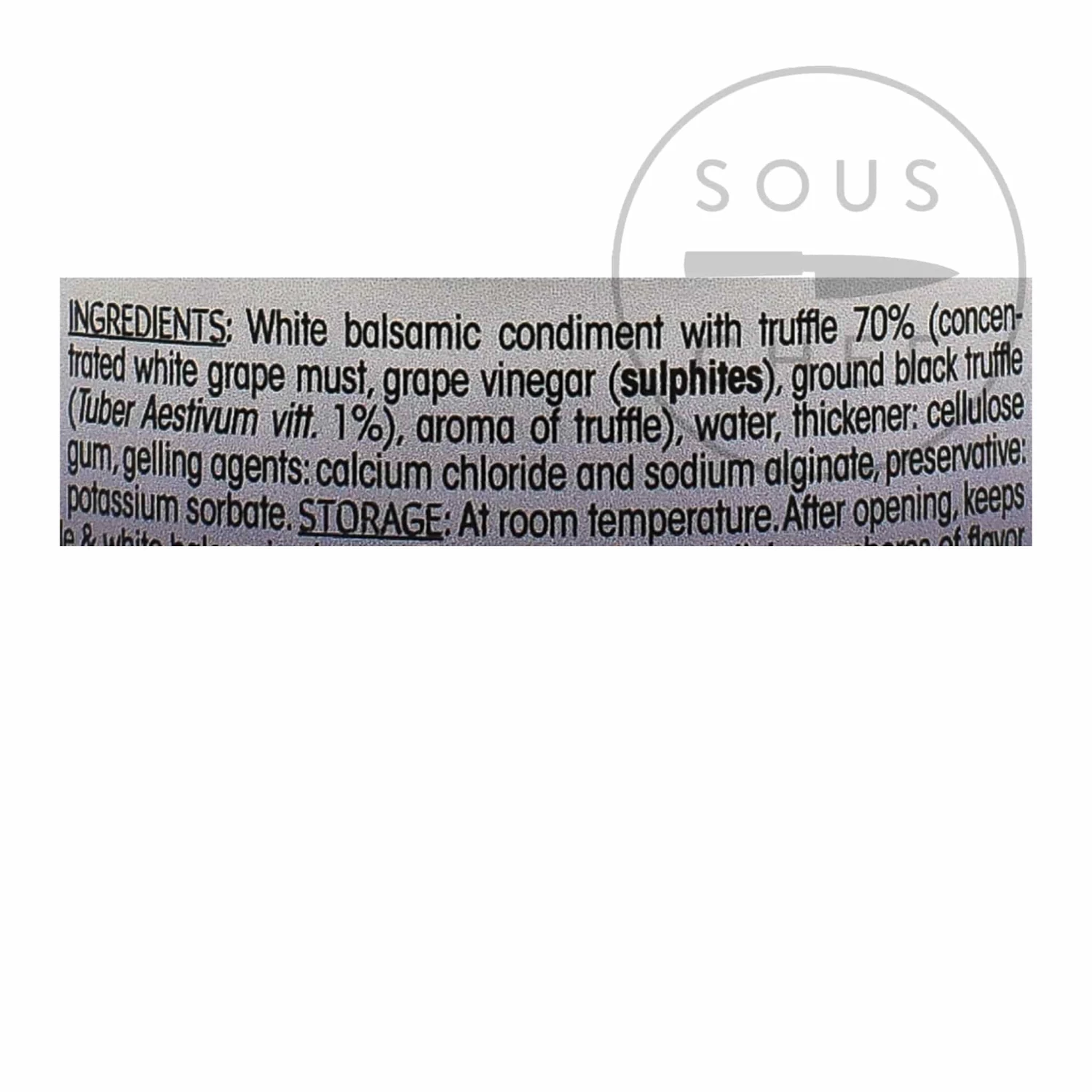 Ingredients: White balsamic condiment with 70% truffle (concentrated white grape must, grape vinegar (sulphites), ground black truffle (Tuber Aestivum vitt. 1%), aroma of truffle), water, thickener: cellulose gum, gelling agents: calcium chloride and sodium alginate, preservative: potassium sorbate.Â