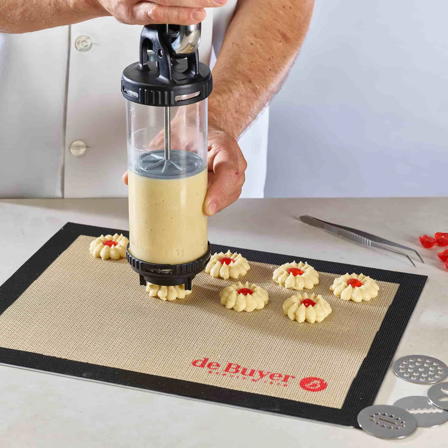 The pastry syringe lets you set precisely how much batter, pastry mixture or frosting you want to dispense with each squeeze of the handle. Fill a cupcake tray with exactly the same amount of batter in each hollow, or ‘pipe’ identical amounts of macaron mixture onto a baking sheet.