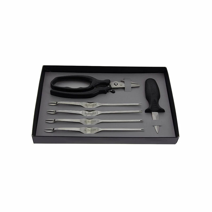 The De Buyer shellfish set comes with the essential tools to tackle most shellfish and seafood. The set includes:
