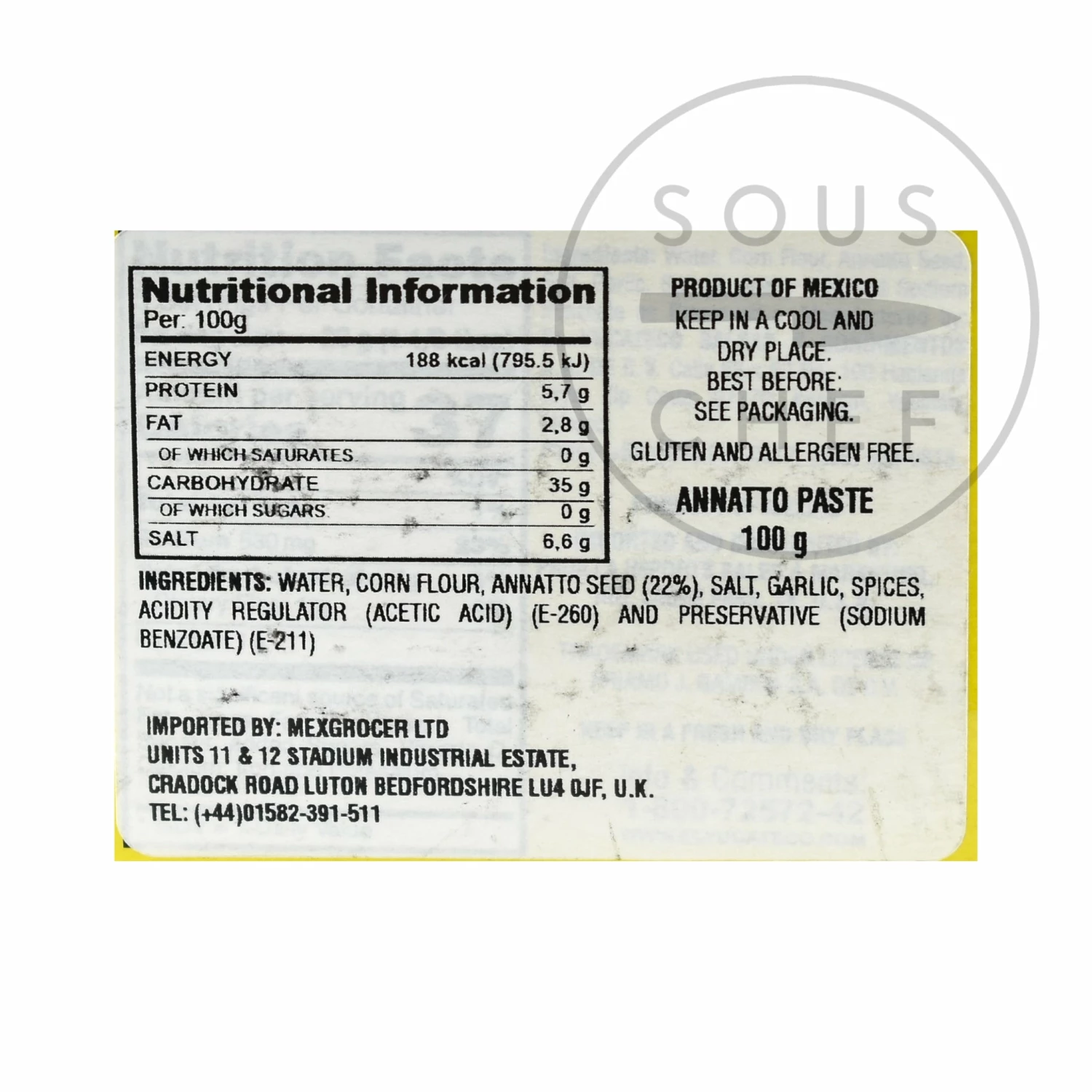 Ingredients 100g:Â Water, corn flour, annatto seeds (22%), salt, garlic, spices, acidity regulator(acid acid) E260 and preservative (sodium benzoate) E211.