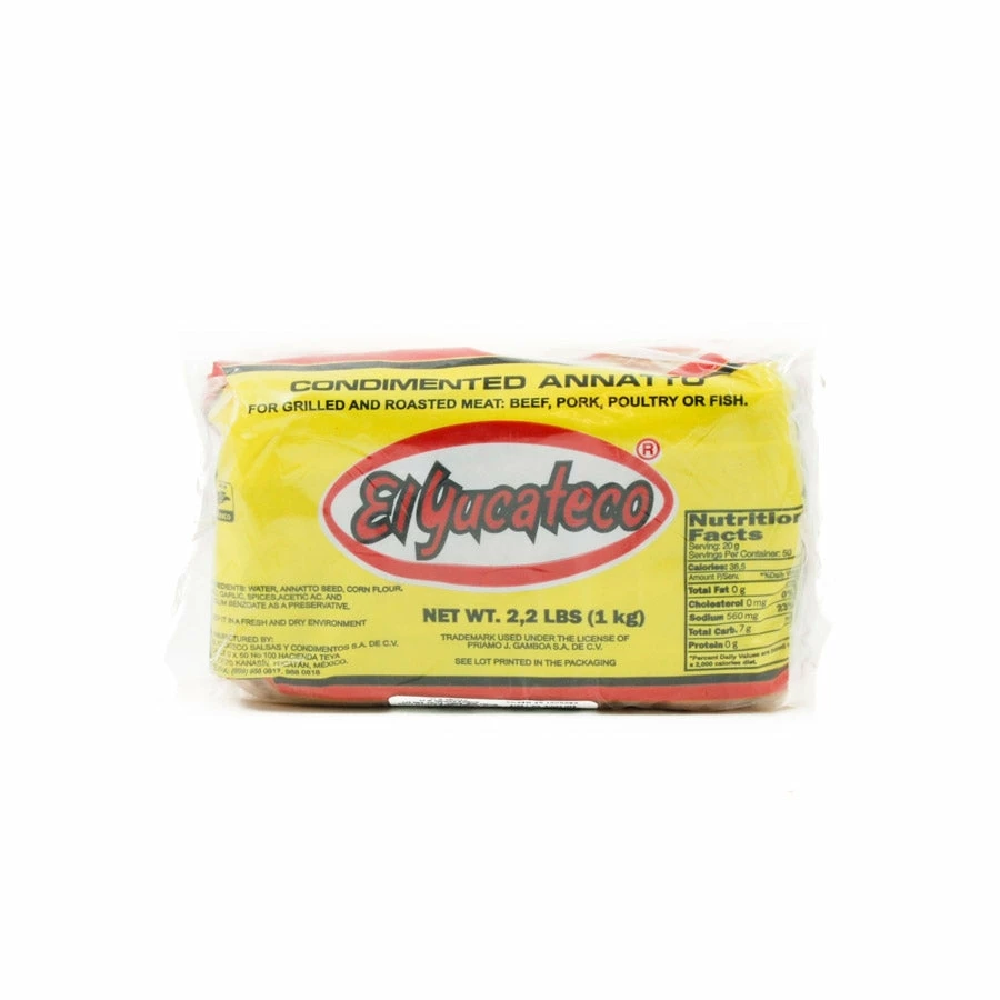 Ingredients 1kg: water, annatto seeds, corn flour, salt, garlic, spices, acetic acid, sodium benzoate – as a preservative.