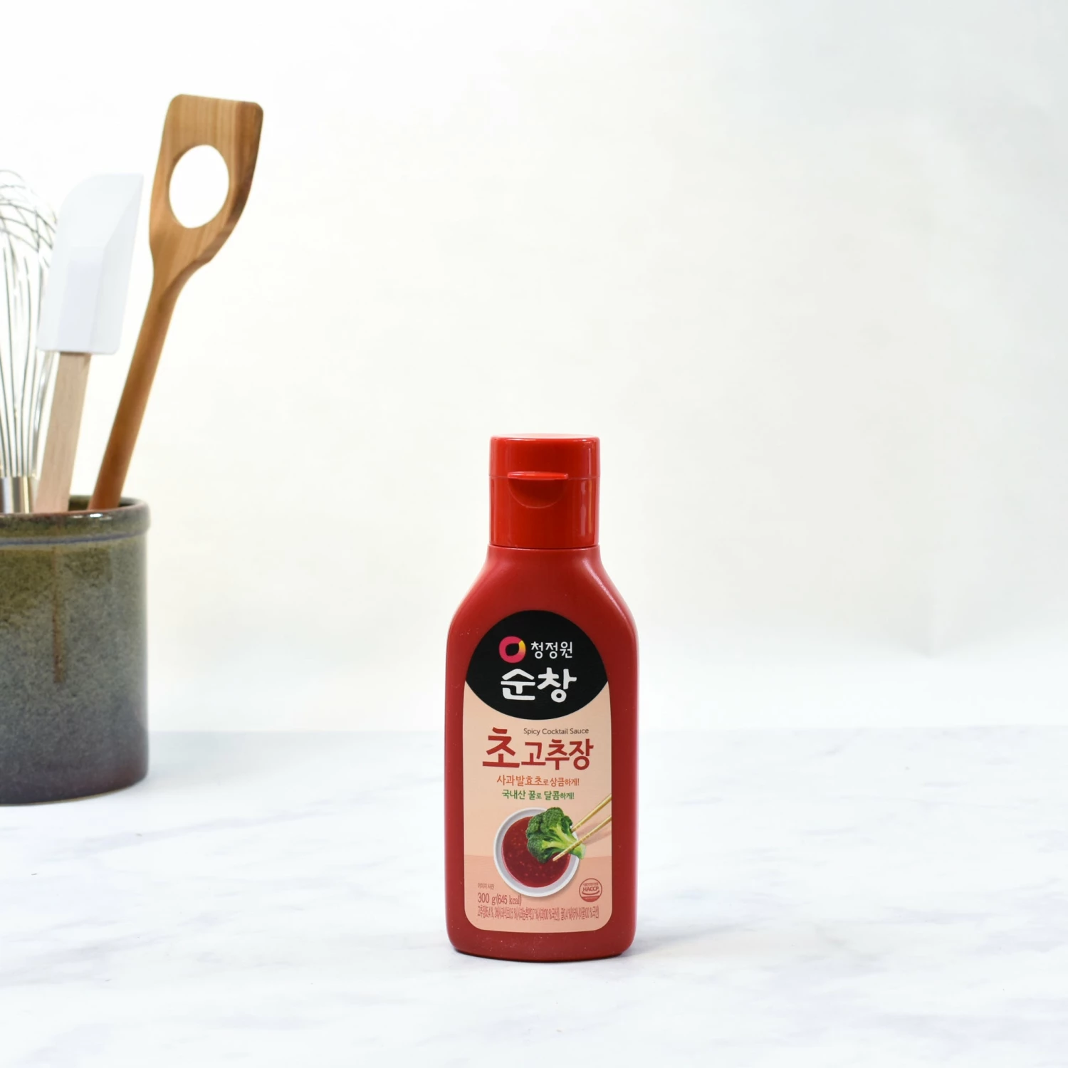 The vinegar is mixed together with gochujang to make it a little easier to pour, and brings an acidic note that perfectly complements seafood. We love the vinegared red chilli sauce served with a squid bibimbap: garnish a bowl of warm rice with grated carrots, baby leaves, beansprouts, a fried egg, tobiko fish roe, and finely chopped sashimi grade squid or cooked squid, and toss together with the chilli sauce at the table.