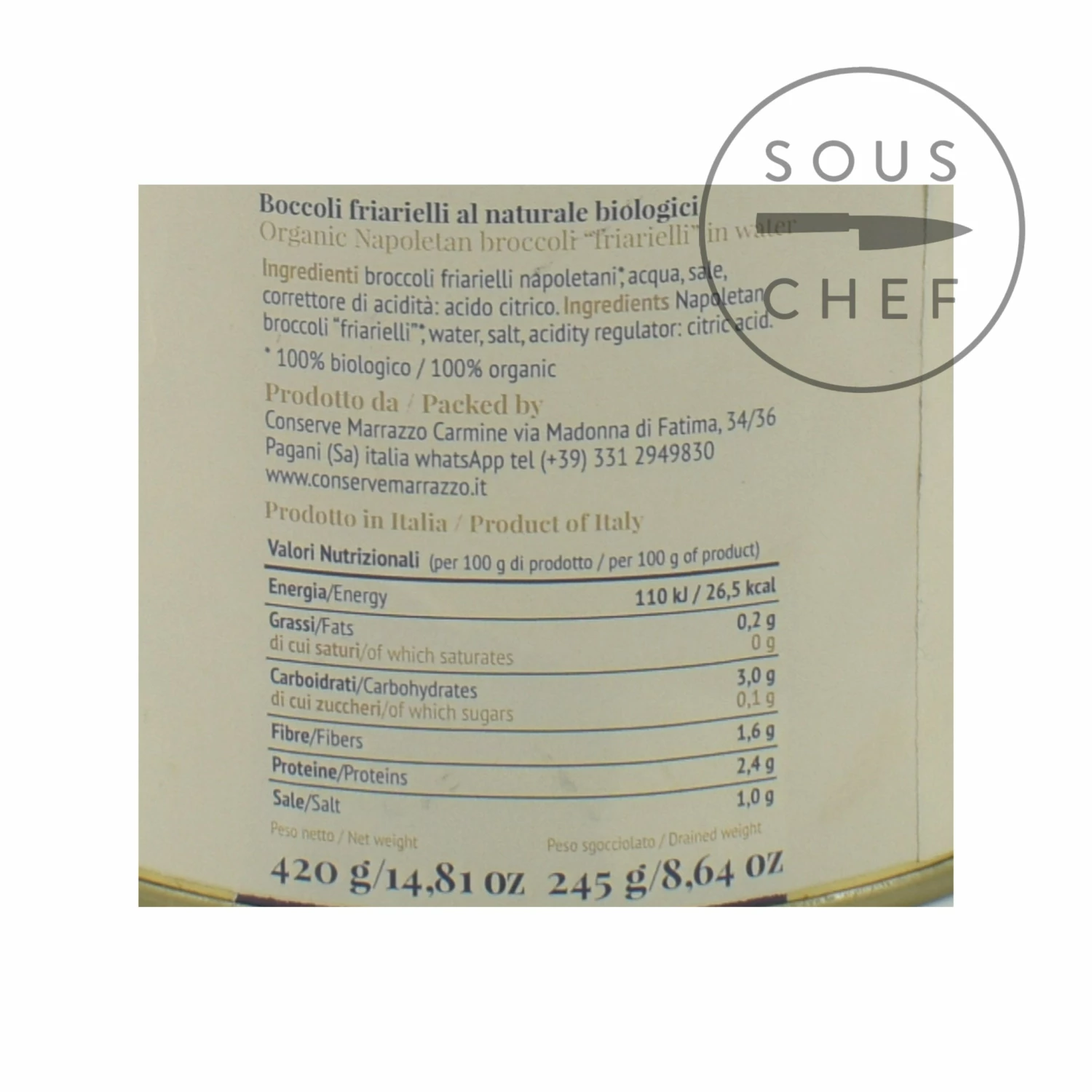 Ingredients: Neapolitan ‘friarielli’ broccoli*, water, salt, acidity regulator: citric acid (*100% organic)