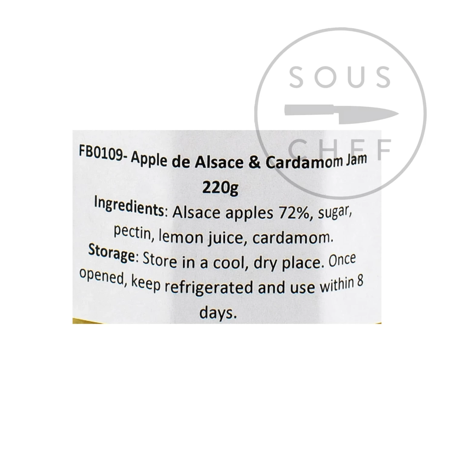 Ingredients: Alsace apples 72%, sugar, pectin, lemon juice, cardamom.