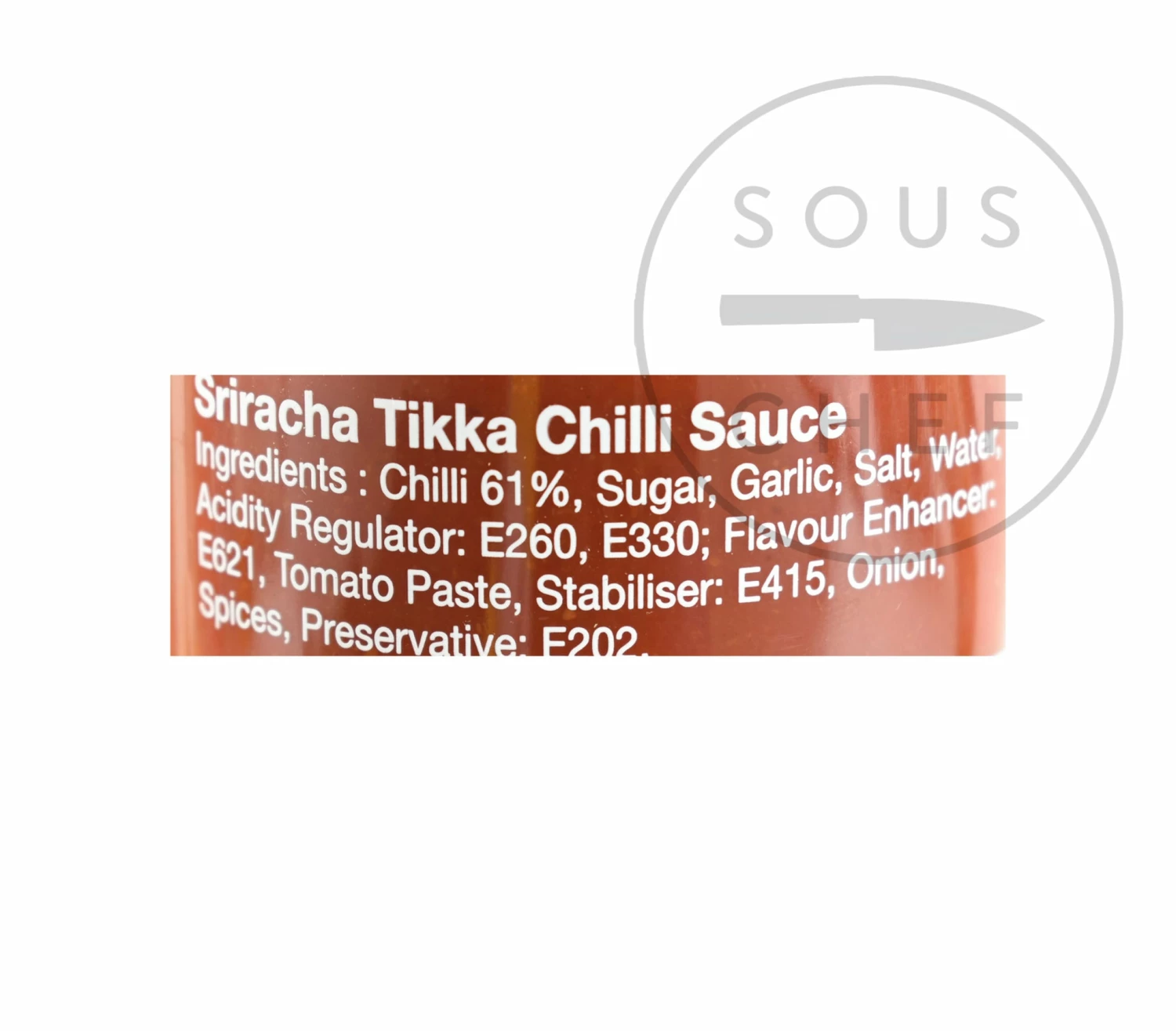 Ingredients: Chilli 61%, sugar, garlic, salt, water, acidity regulator: E260, E330; flavour enhancer: E621, tomato paste, stabiliser: E415, onion, spices, preservative: E202.