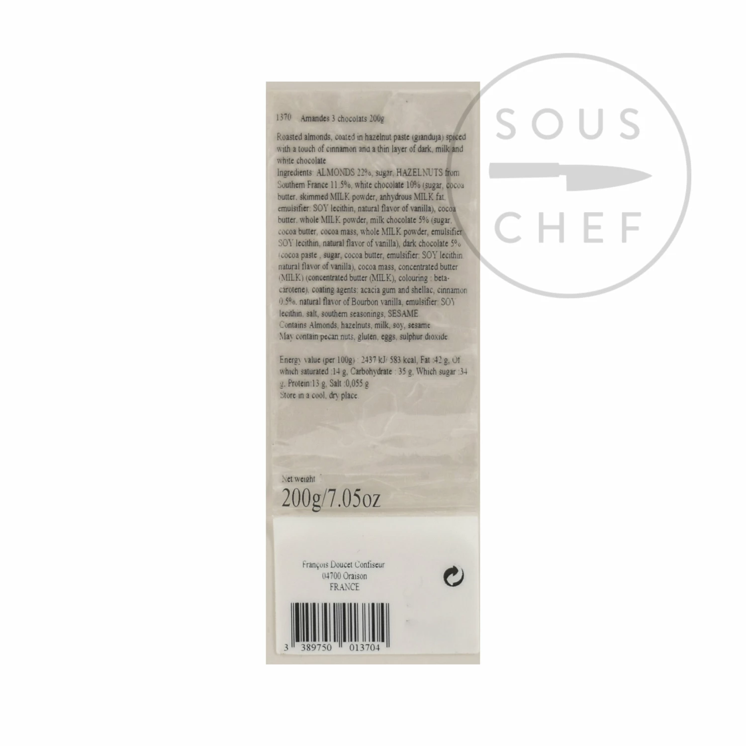 Ingredients: Almonds 22%, sugar, hazelnuts from Southern France 11.5%, white chocolate 10% (sugar, cocoa butter, skimmed milk powder, anhydrous milk fat, emulsifier: soy lecithin, natural flavour of vanilla), cocoa butter, whole milk powder, milk chocolate 5% (sugar, cocoa butter, cocoa mass, whole milk powder, emulsifier: soy lecithin, natural flavour of vanilla), dark chocolate 5% (cocoa paste, sugar, cocoa butter, emulsifier: soy lecithin, natural flavour of vanilla), cocoa mass, concentrated butter (milk) (concentrated butter (milk), colouring, beta-carotene), coating agent: acacia gum and shellac, cinnamon, natural flavour of Bourbon vanilla, emulsifier: soy lecithin, salt, southern seasonings, sesame. May contain pecan nuts, gluten, eggs, sulphur dioxide. Allergens listed in bold.