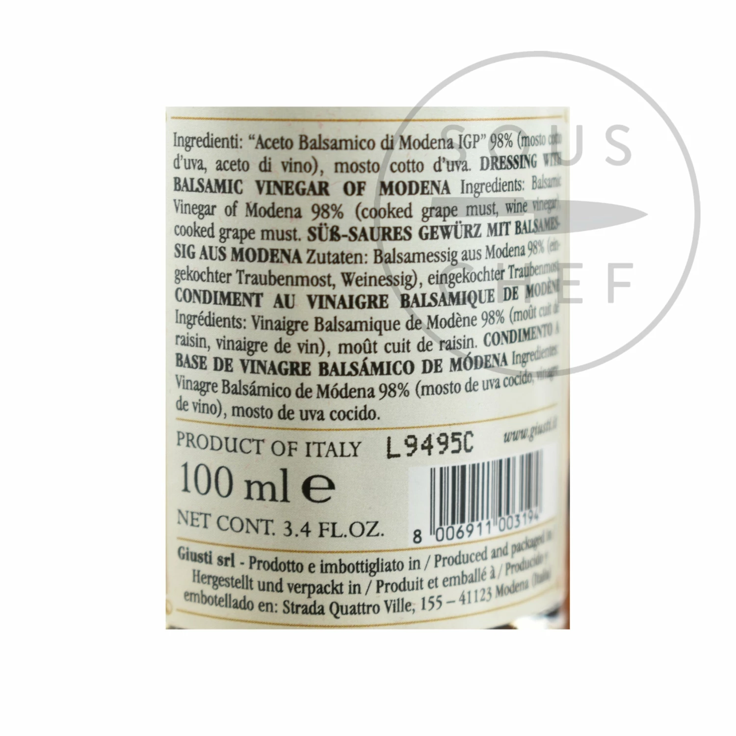 Ingredients: Balsamic vinegar of Modena 98% (cooked grape must, wine vinegar), cooked grape must.