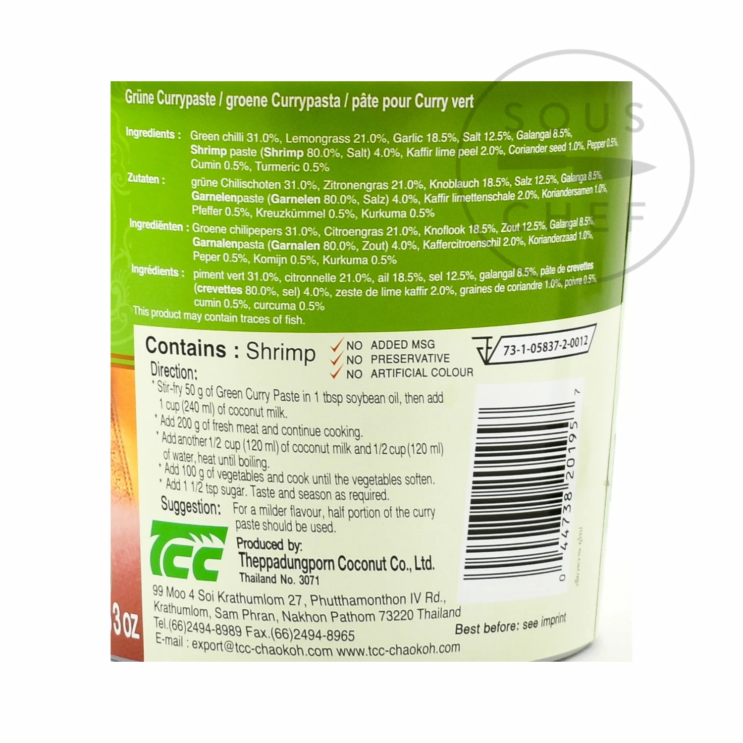 Ingredients: Green chilli, lemongrass, garlic, salt, galangal, shrimp paste (shrimp (crustaceans), salt), kaffir lime peel, coriander seed, pepper, cumin, turmeric. Allergens are listed in bold. May contain fish.