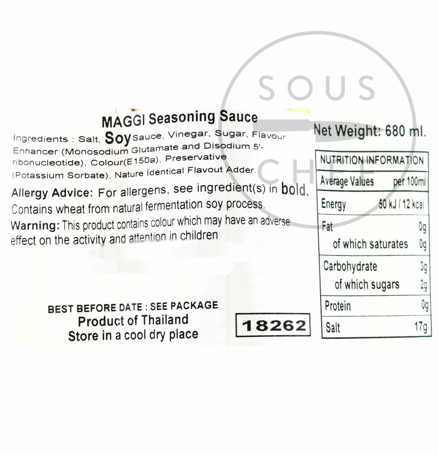 Ingredients: salt, soy sauce, vinegar, sugar, flavour enhancer (MSG, Disodium 5 – ribonucleotide), colour (E150a), preservative (potassium sorbate), nature identical flavour added.Â