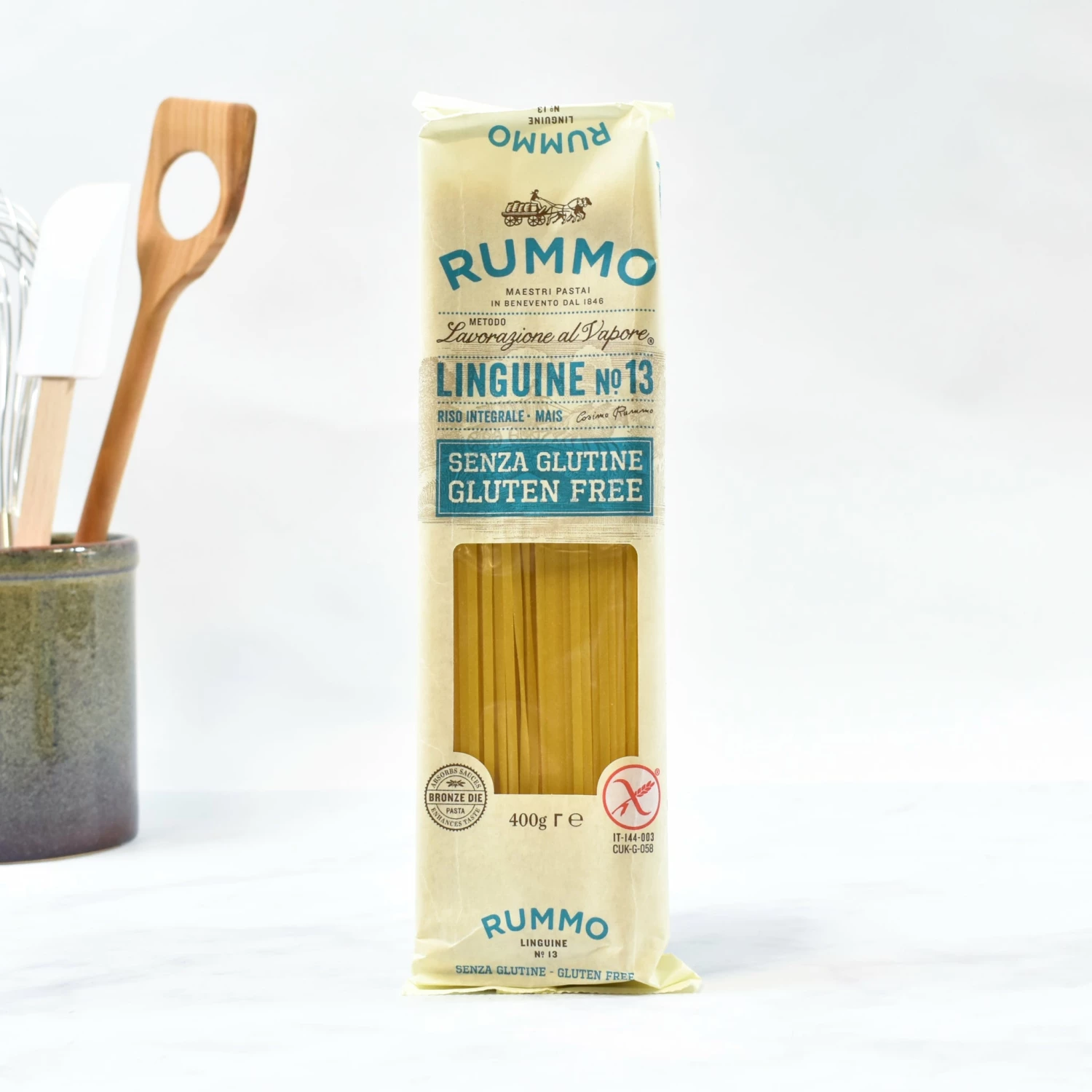 Rummo linguine pasta no. 13 brings you a gluten-free version of this classic pasta shape. Rummo gluten-free pastas are made with rice and GMO-free corn. The pasta shapes are drawn through a bronze die, to give the pasta a texture that your sauce will cling to. Rummo gluten-free linguine cooks in 11 minutes.