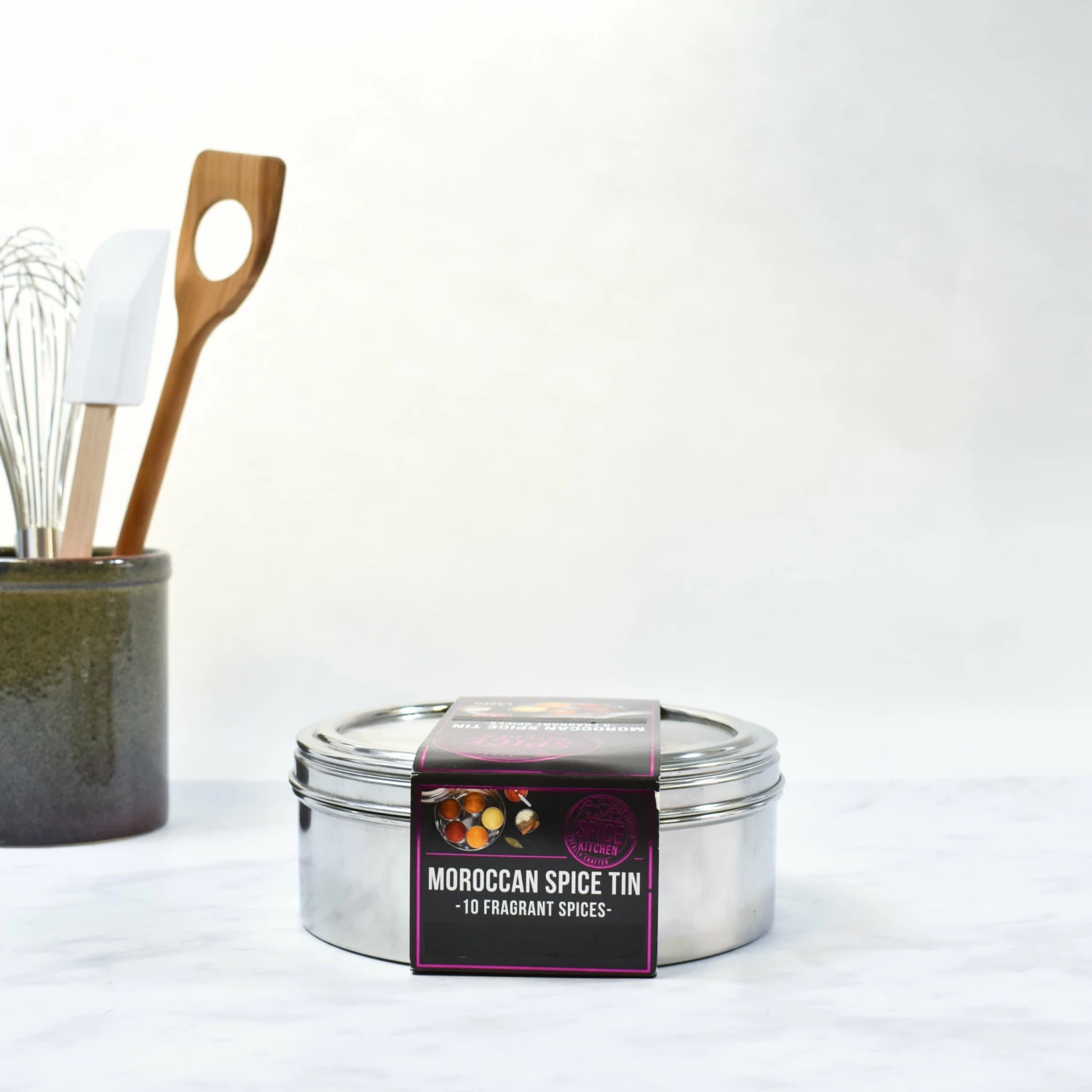 The Spice Kitchen Moroccan spice tin will transport you to the soukhs of Marrakech. It’s the ideal gift for anyone wanting to recreate authentic Moroccan dishes at home. The selection of 9 essential spices is presented in a spice tin, or masala dabba.