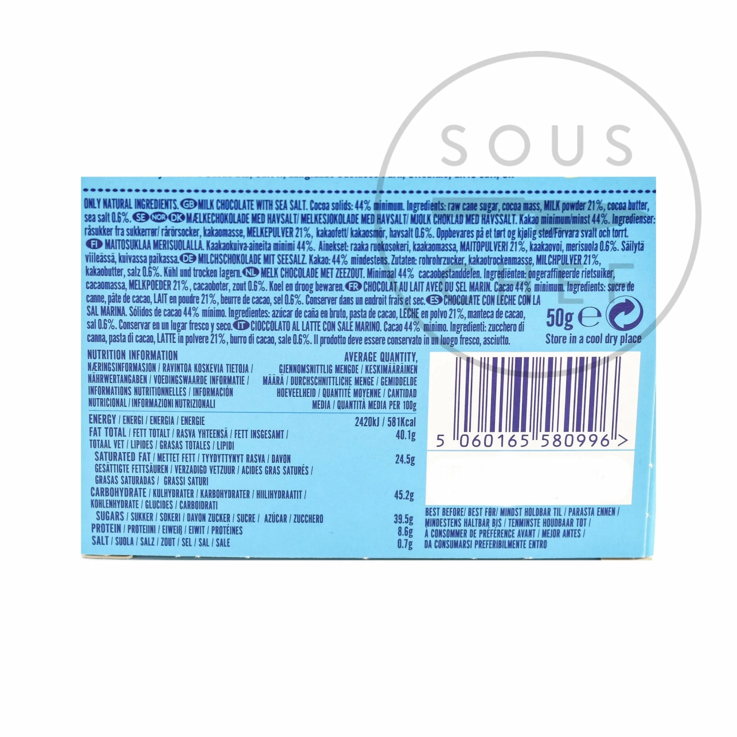 Ingredients: Raw cane sugar, cocoa mass, milk powder 21%, cocoa butter, sea salt 0.6%