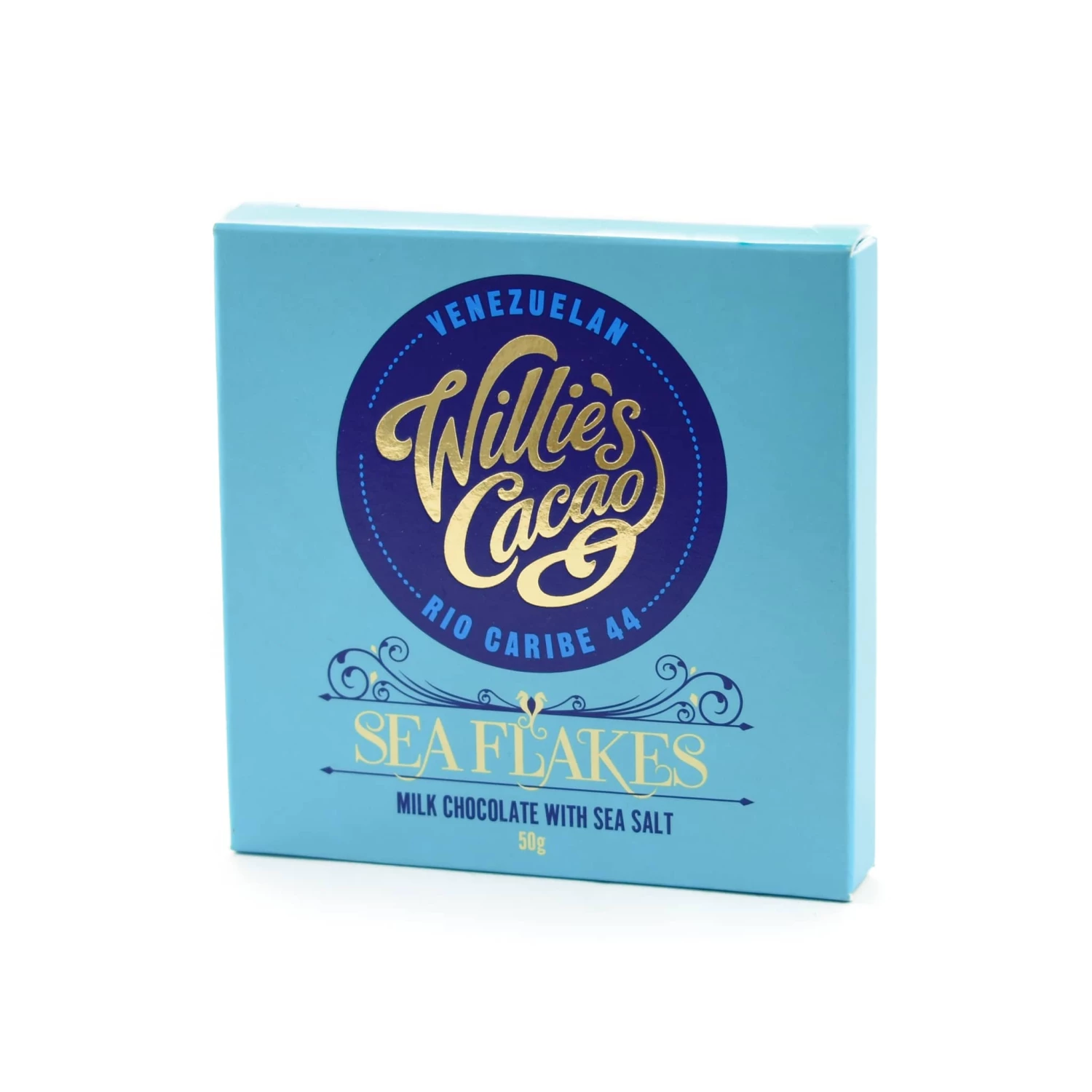Willie’s Cacao milk chocolate with sea salt is 100% natural, made with Rio Caribe milk chocolate. The Venezuelan cocoa is pure and creamy, with sea salt flecks adding a gentle crunch. You can enjoy this 44% milk chocolate straight from the packet, or add chunks to cookies for a sweet, salty kick.