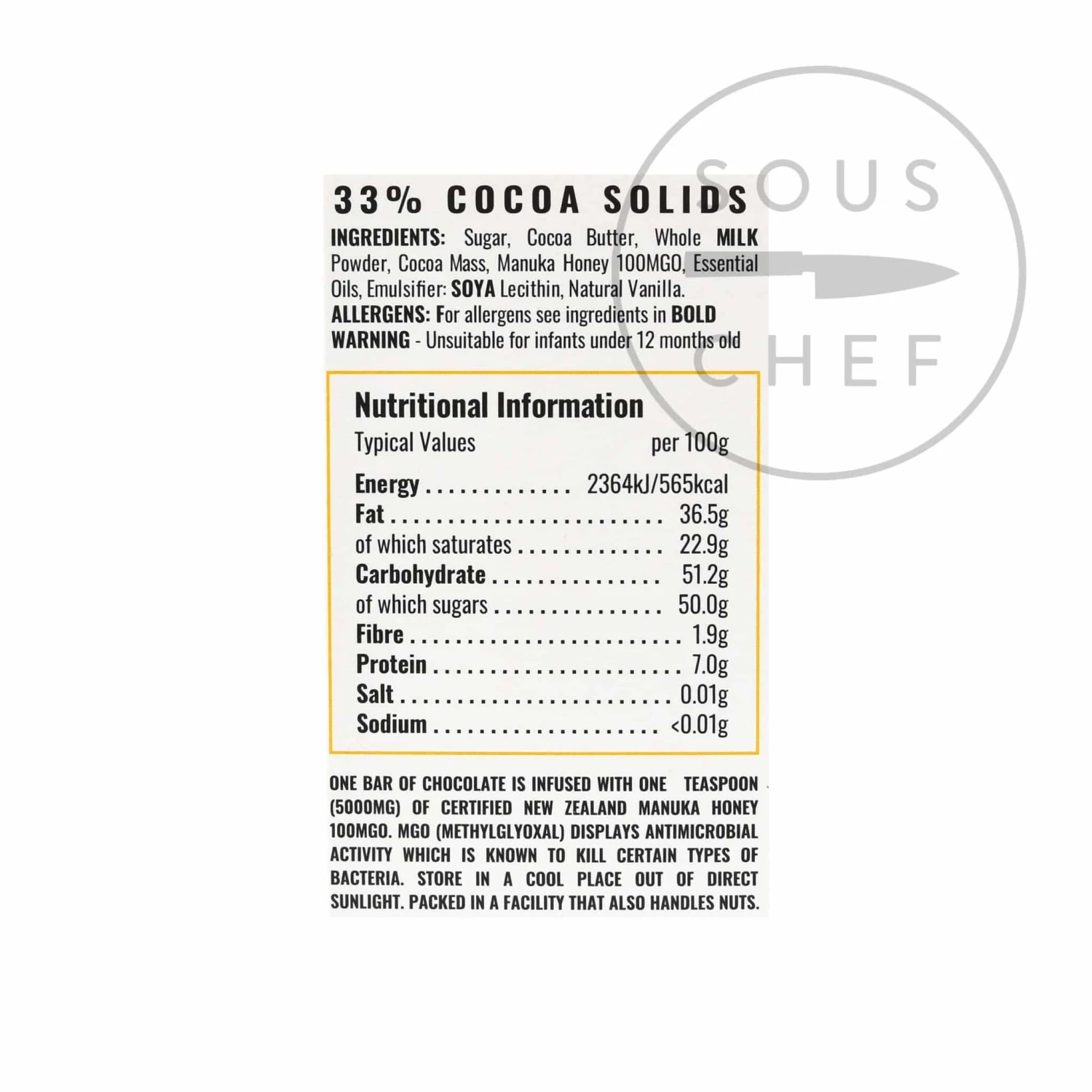 Ingredients: Sugar, Cocoa Butter, Whole Milk Powder, Cocoa Mass, Manuka Honey 100MGO, Essential Oils, Emulsifier: Soya Lecithin, Natural Vanilla.