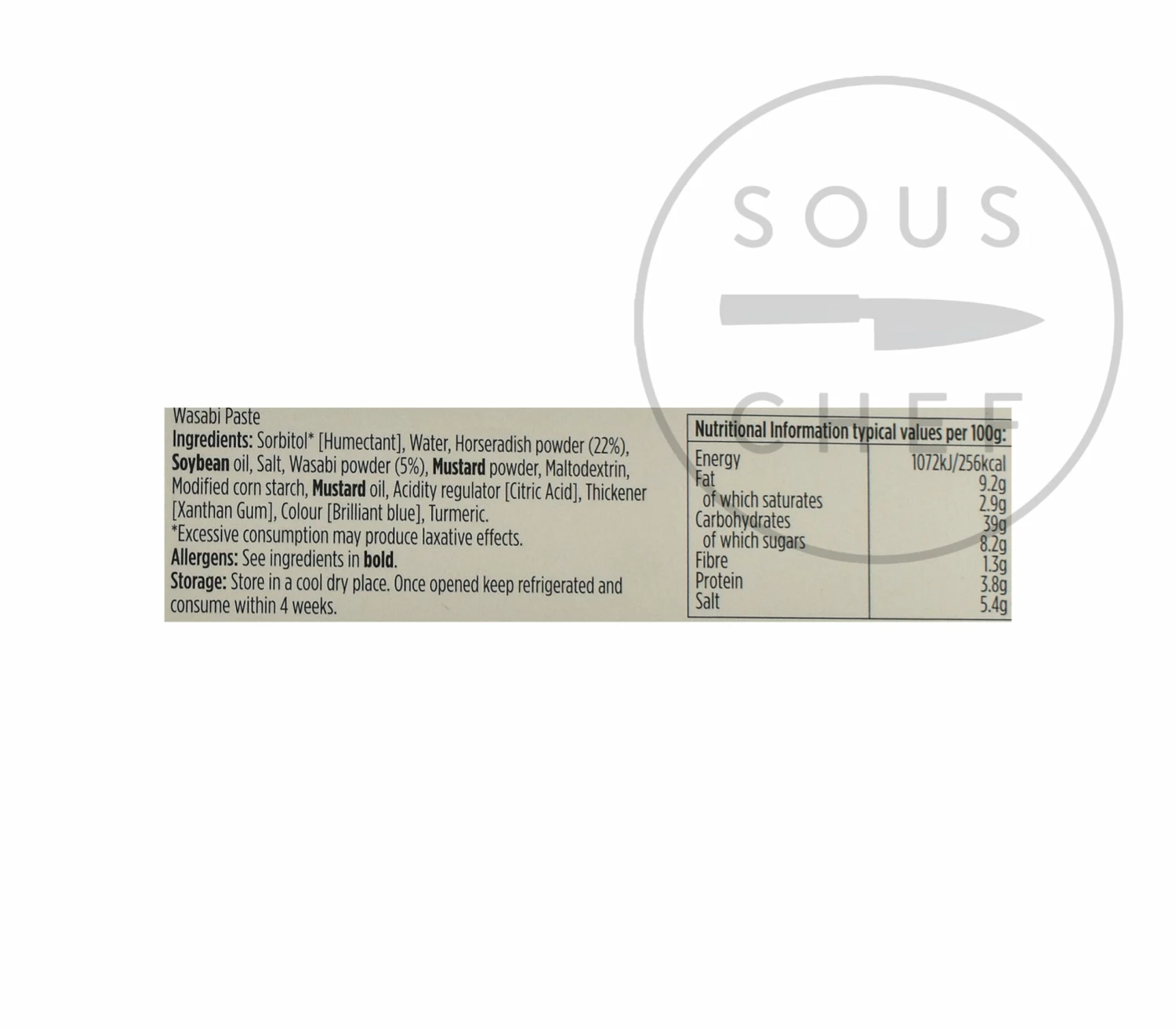 Ingredients: Sorbitol* (Humectant), water, horseradish powder (22%), soybean oil, salt, wasabi powder (5%), mustard powder, maltodextrin, modified corn starch, mustard oil, acidity regulator (citric acid), thickener (xanthan gum), colour (brilliant blue), turmeric. *Excessive consumption may produce laxative effects.