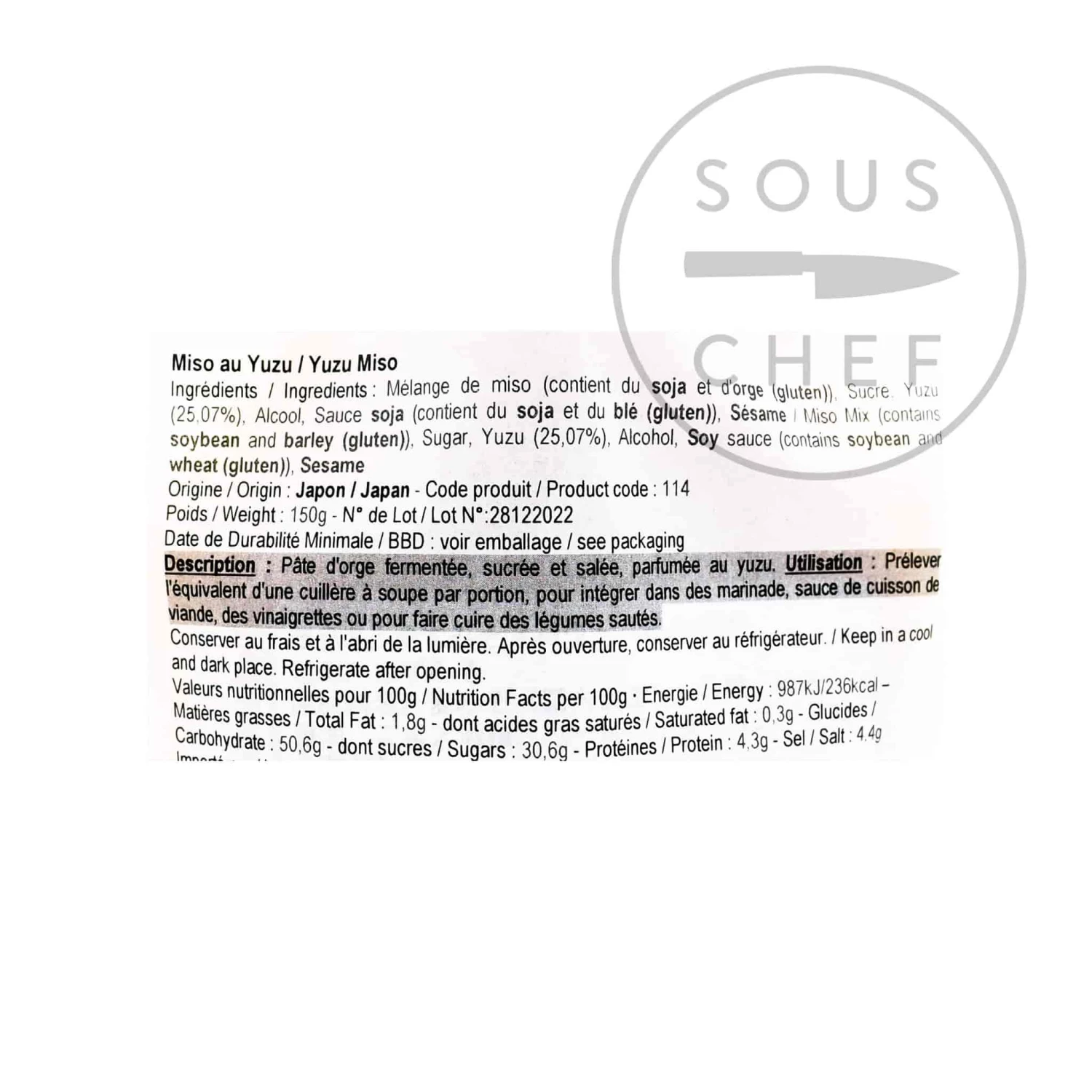 Ingredients: Miso mix (contains soybean and barley (gluten)), sugar, yuzu (25.07%), alcohol, soy sauce (contains soybean and wheat (gluten), sesame.