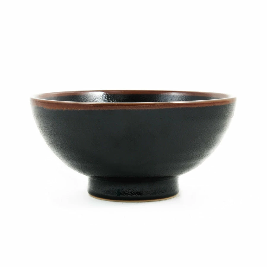 This black stoneware ramen bowl with a dimpled texture and brown rim makes for an attractive piece of tableware. The black glaze creates a dramatic background, working particularly well against both light food, such as rice dishes or chowders, and brightly-coloured soups or fresh salads.
