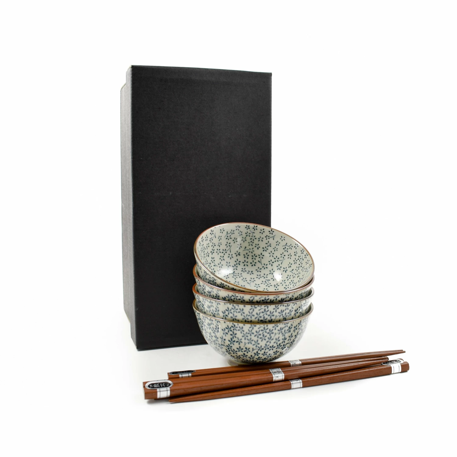 The 4 neutral-toned bowls are decorated with cascades of blue flowers. The set comes with 4 pairs of brown wooden chopsticks and is presented in a smart gift box.