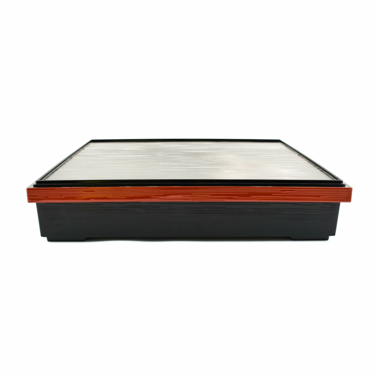 The bento box is designed to resemble traditional Japanese lacquered wood. The outside of the box is black with a wood-grain texture, while the interior is a glossy red.