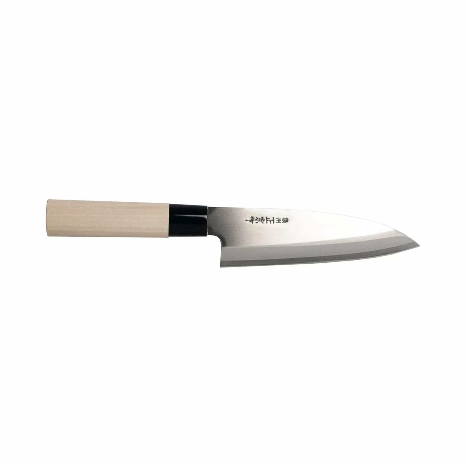 Use this Japanese deba knife for filleting and slicing fish. The traditionally shaped 15cm blade is a useful tool for many kitchen tasks. You’ll use this Japanese deba for prepping meat and fish. It’s a single bevelled knife, which means only one side is sharpened while the other is flat. The thicker, heavier design helps it cut through fish bones and tougher tendons easily.Â
