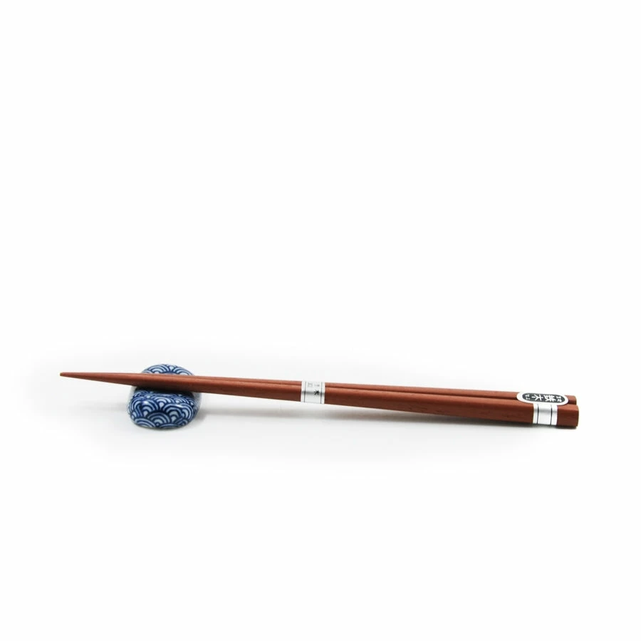 The blue Japanese chopstick & rest set is an instant and elegant Japanese table setting for four people. The set includes four pairs of dark wooden chopsticks with porcelain chopstick rests.