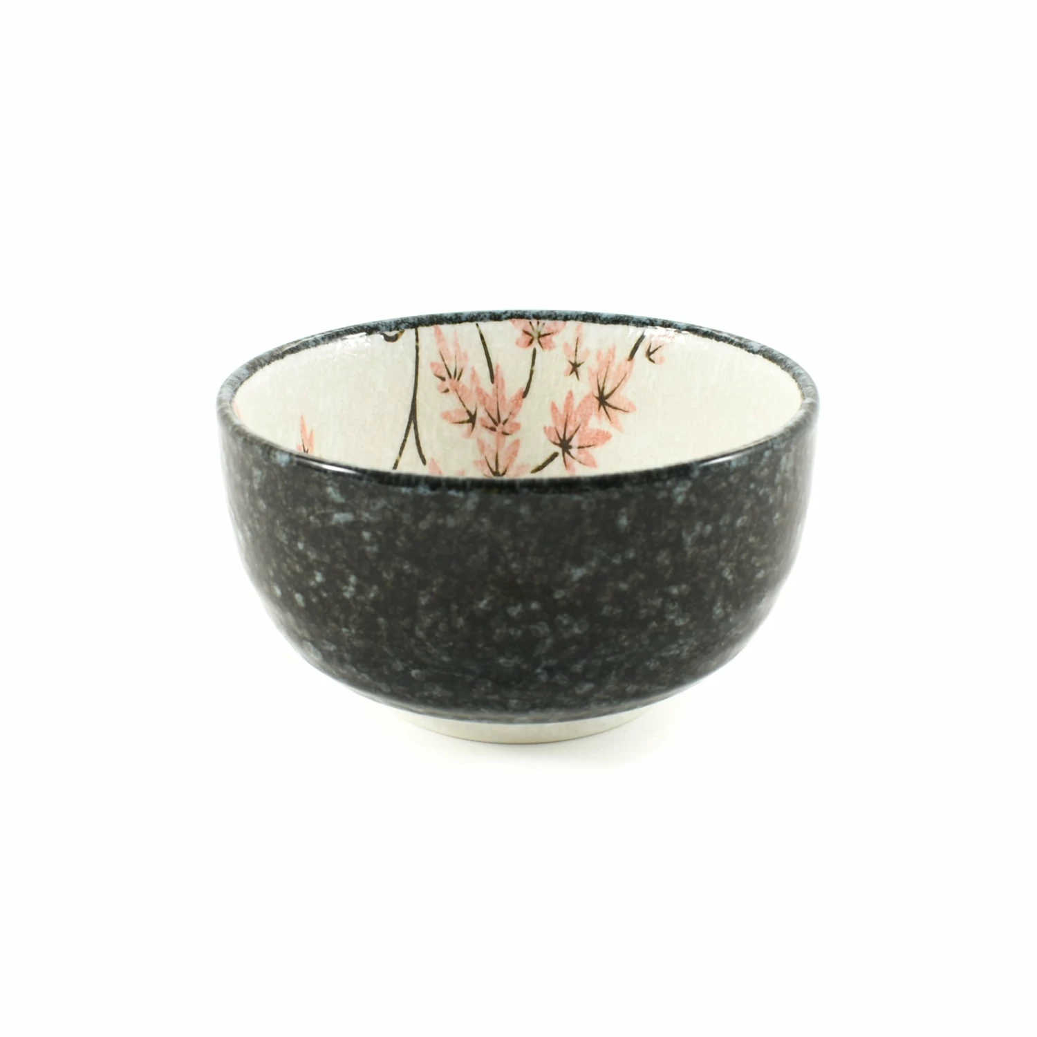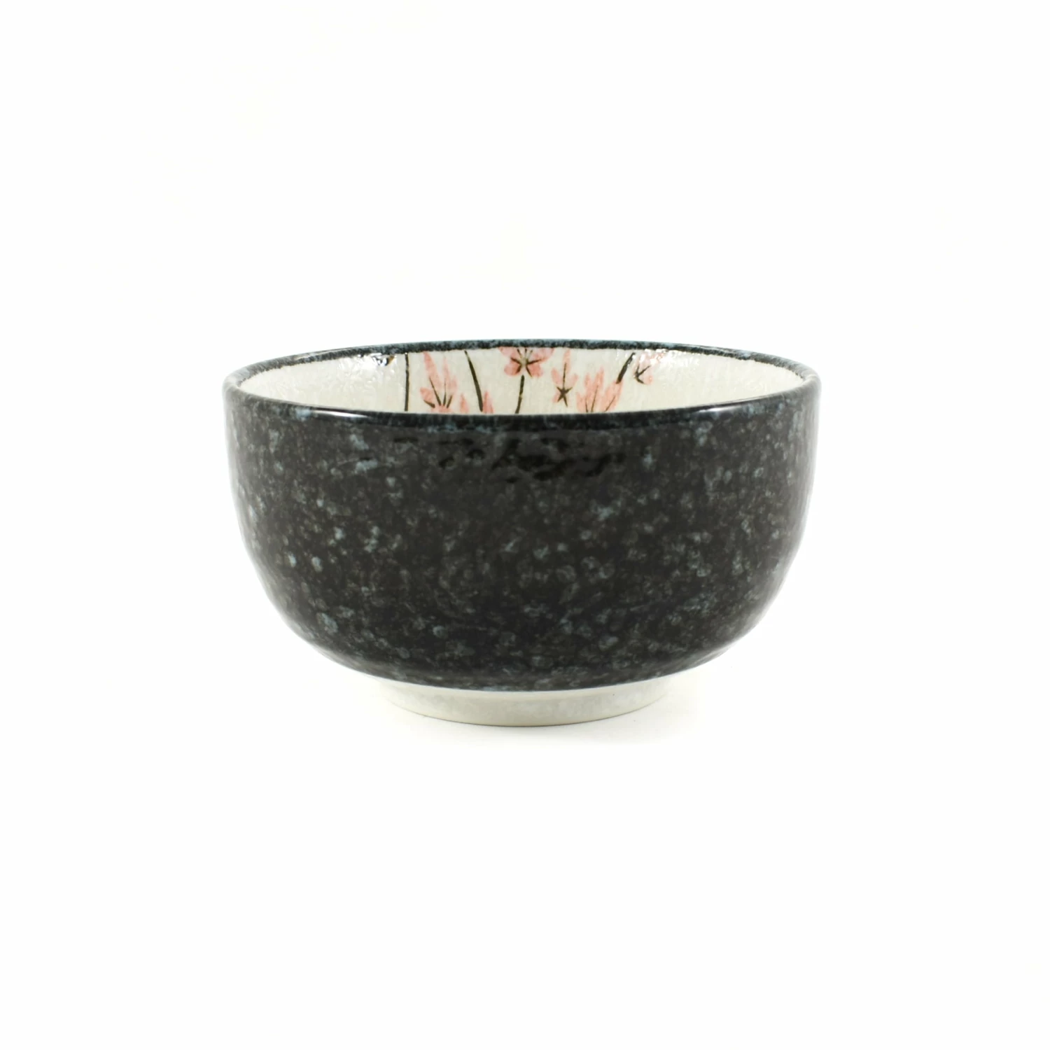This delicate bowl is decorated with a speckled slate grey pattern on the outside, and pale pink floral pattern on the inside.Â