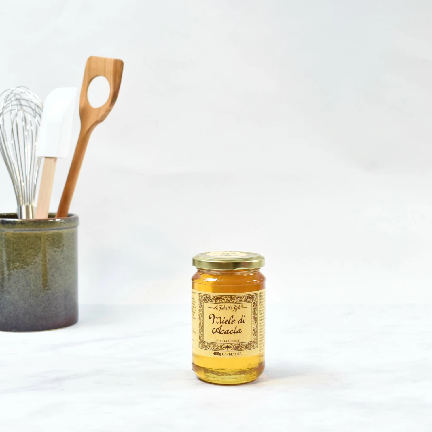 La Favorita acacia honey is the ideal partner for a cheeseboard. The delicate honey goes with most cheese – from a mild, creamy ricotta, to a strong gorgonzola piccante.