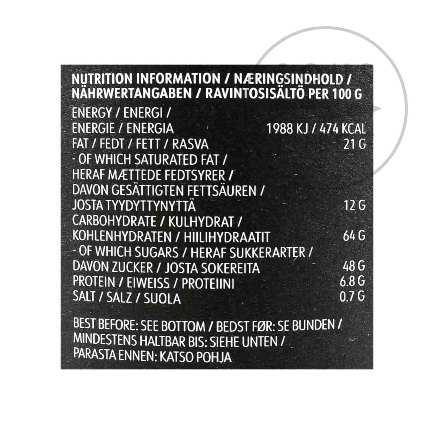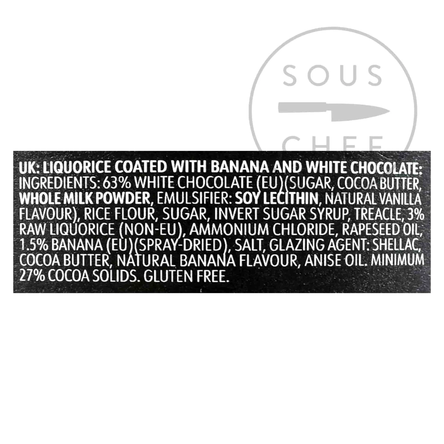 Ingredients: 63% white chocolate (sugar, cocoa butter, whole milk powder, emulsifier: soy lecithin, natural vanilla flavour), rice flour, sugar, invert sugar syrup, treacle, 3% raw liquorice, ammonium chloride, 1.5% banana (spray-dried), rapeseed oil, salt, glazing agent: shellac, cocoa butter, anise oil, natural banana flavour. Minimum 27% cocoa solids.Â