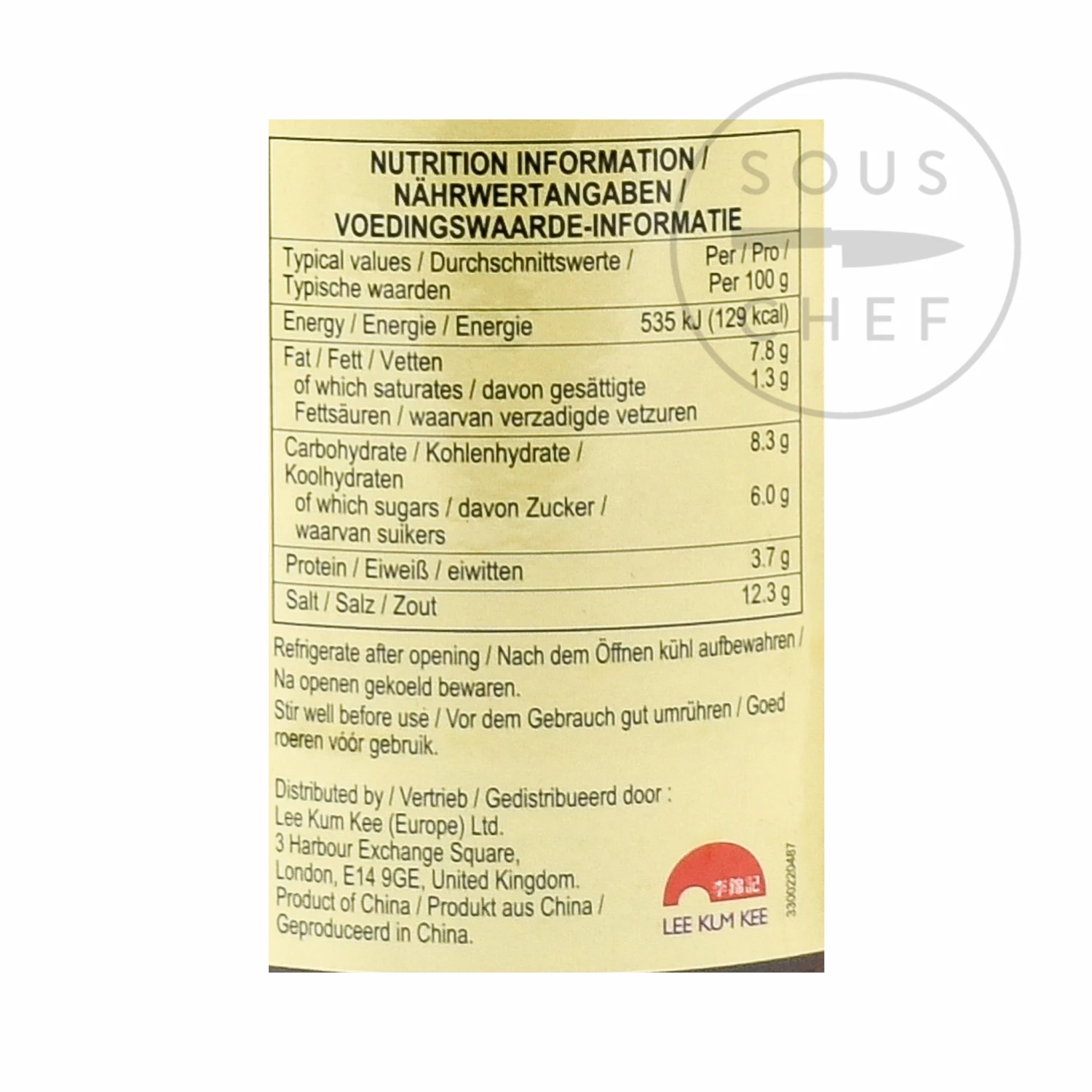 Ingredients: Salted Chilli Peppers 39% (Chilli Peppers, Salt), Fermented Soybean Paste 20% (Water, Salt, Soybeans, Wheat Flour),Water, Soy Sauce (Water, Salt, Soybeans, Wheat Flour), Sugar, Dehydrated Garlic, Sesame Oil, Colour E150a, Soybean Oil, Chilli Pepper Powder 2%, Shallots, Modified Corn Starch, Acid E270. Allergens are listed in bold.