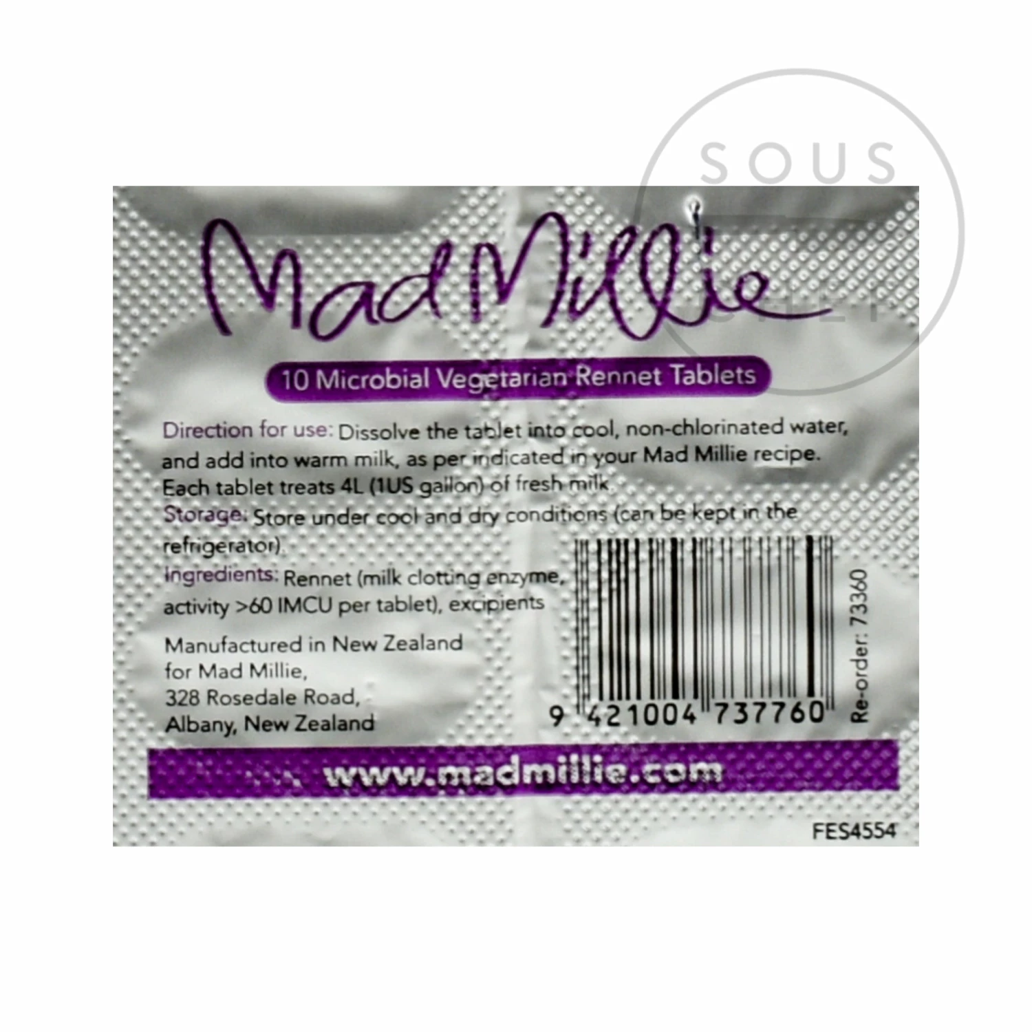 Contains 10 tablets. Ingredients: rennet (milk clotting enzyme, activity >60 IMCU per tablet) excipients.