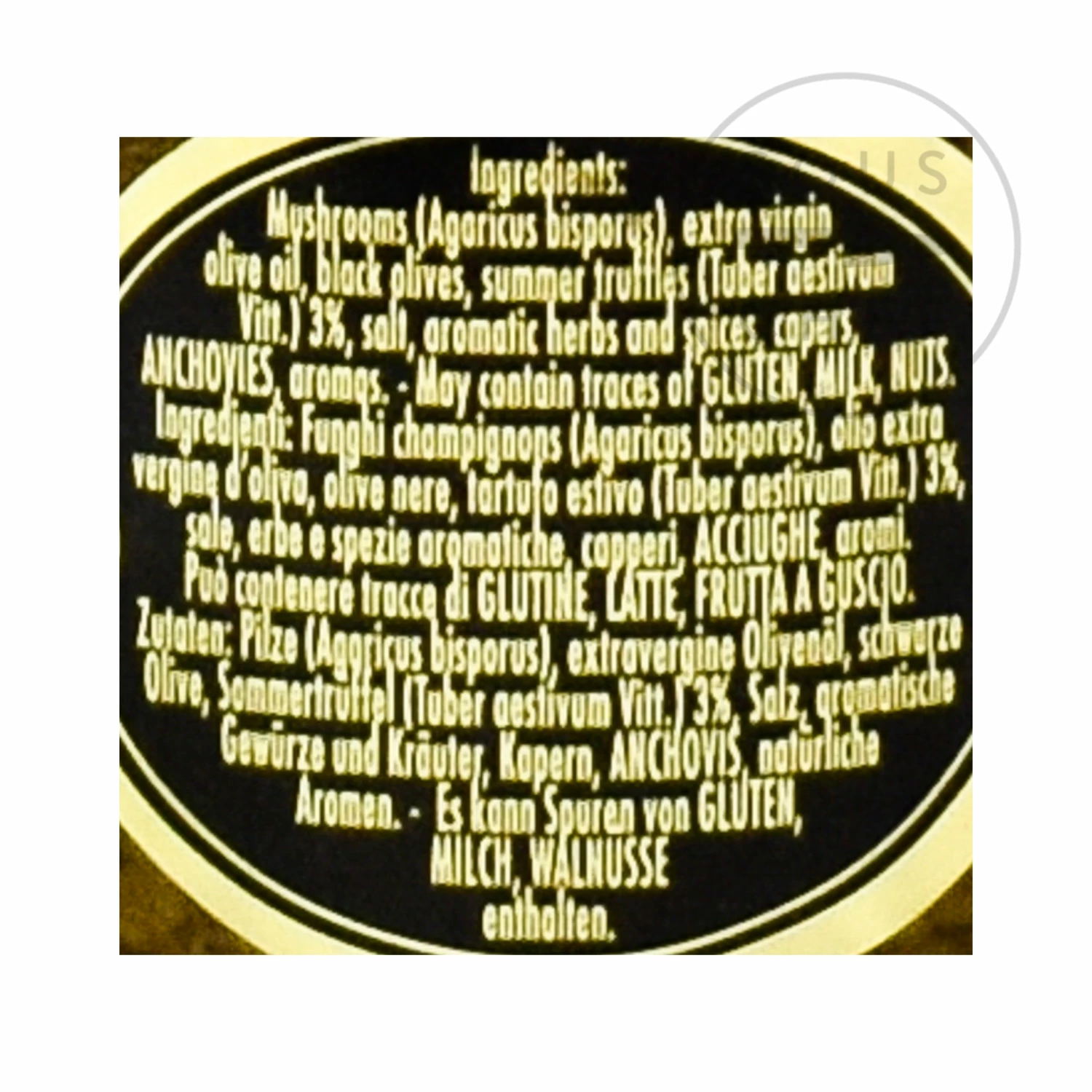 Ingredients: Mushrooms, extra virgin olive oil, black olives, summer truffles (tuber aestivum vitt) 3%, salt, aromatic herbs and spices, capers, anchovies, aromas. Contains fish. May contain traces of gluten, milk, celery, nuts.