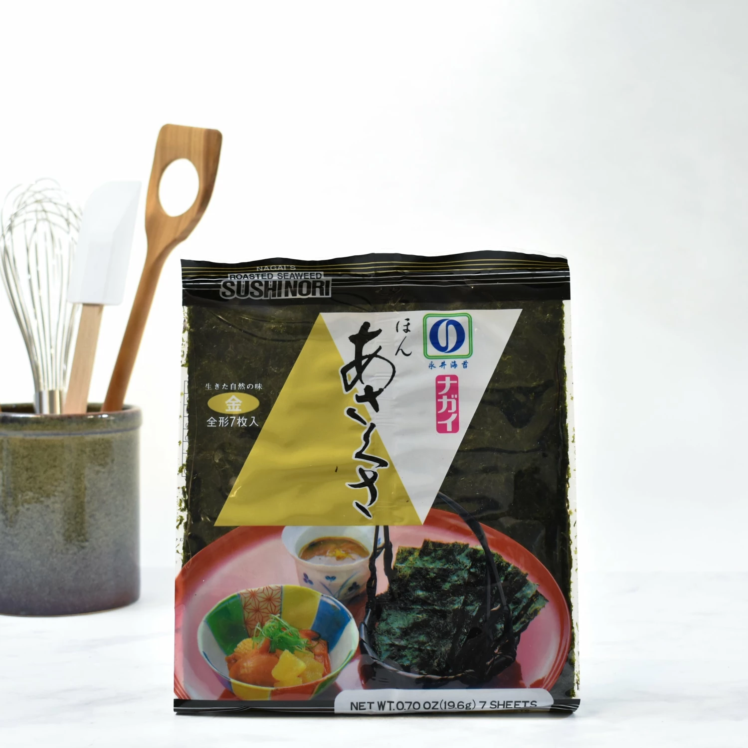 Seven sheets of premium nori seaweed. This gold grade, or gold nori, is tissue paper-thin and deep black in colour. The roasted nori sheets are perfect for making maki rolls or wrapping onigiri rice balls.