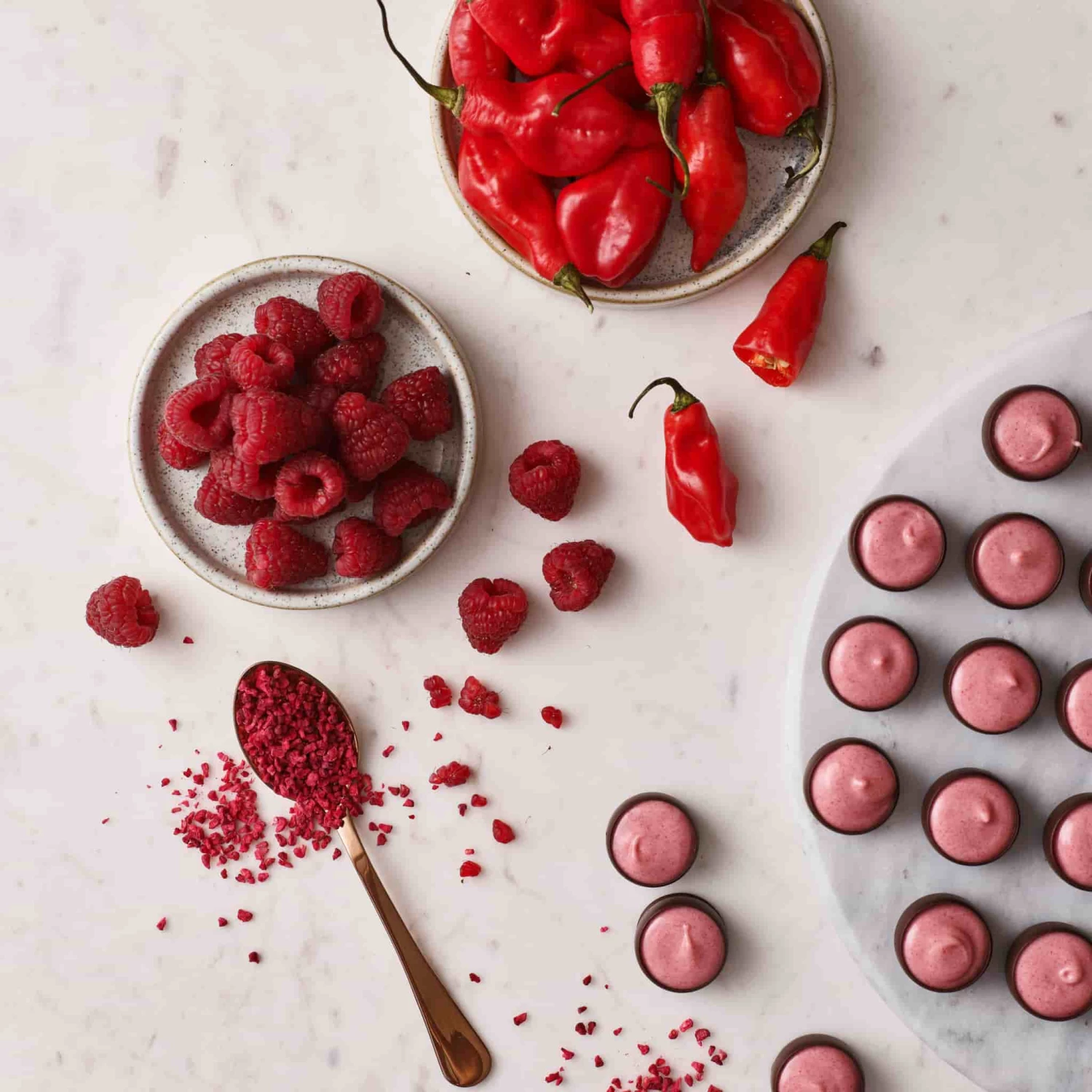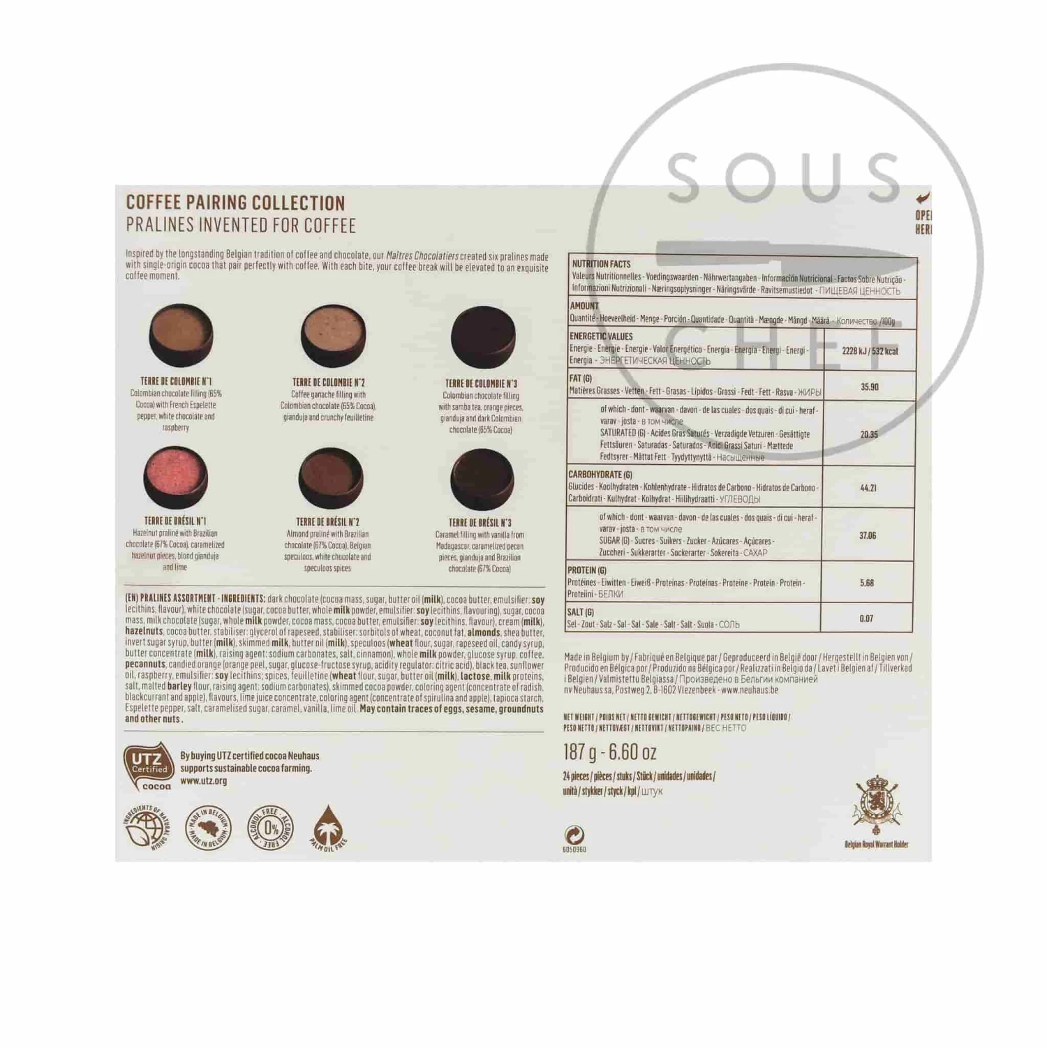 The elegant box is filled with 3 rows of chocolate pralines, each one made with beans from Brazil and Colombia – two countries leading the way in both coffee and cocoa production. Starting with delicate and moving through to intense, the pralines include hazelnut, Speculoos spices, pecan, raspberry, feuilletine and orange.Â