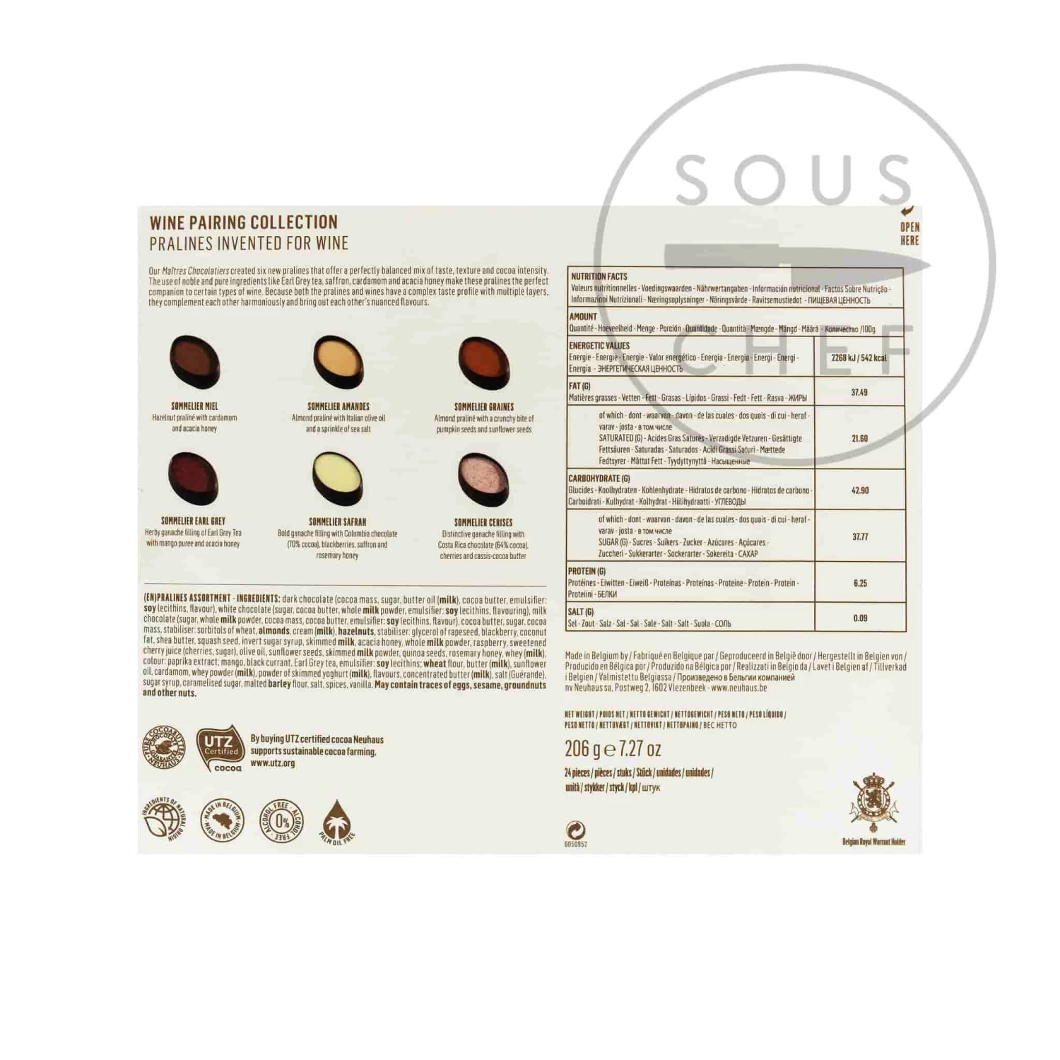Ingredients: dark chocolate (cocoa mass, sugar, butter oil (milk), cocoa butter, emulsifier: soy lecithins, flavour), white chocolate (sugar, cocoa butter, whole milk powder, emulsifier: soy lecithins, flavouring), milk chocolate (sugar, whole milk powder, cocoa mass, cocoa butter, emulsifier: soy lecithins, flavour), cocoa butter, sugar, cocoa mass, stabiliser: sorbitols of wheat, almonds, cream (milk), hazelnuts, stabiliser: glycerol of rapeseed, blackberry, coconut fat, shea butter, squash seed, invert sugar syrup, skimmed milk, acacia honey, whole milk powder, raspberry, sweetened cherry juice (cherries, sugar), olive oil, sunflower seeds, skimmed milk powder, quinoa seeds, rosemary honey, whey (milk), colour: paprika extract;mango, black currant, Earl Grey Tea, emulsifier: soy lecithins; wheat flour, butter (milk), sunflower oil, cardamom, whey powder (milk), powder of skimmed yoghurt (milk), flavours, concentrated butter (milk), salt (Guérande), sugar syrup, caramelised sugar, malted barley flour, salt, spices, vanilla.