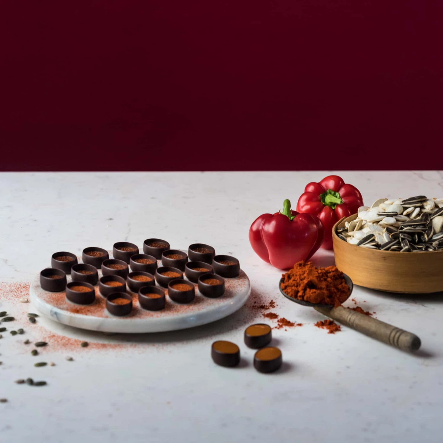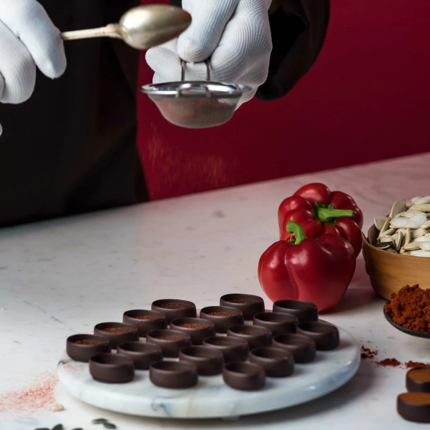 The smart box is filled with 3 rows of chocolate pralines, each one designed to be enjoyed with a different glass of vino. Taste the almond praline with full-bodied wines, the saffron ganache with lighter reds, the Earl Grey with bold reds, the cherry ganache with smoky wines, the hazelnut praline with lighter, floral wines, and finally, the pumpkin praline with a dry white.