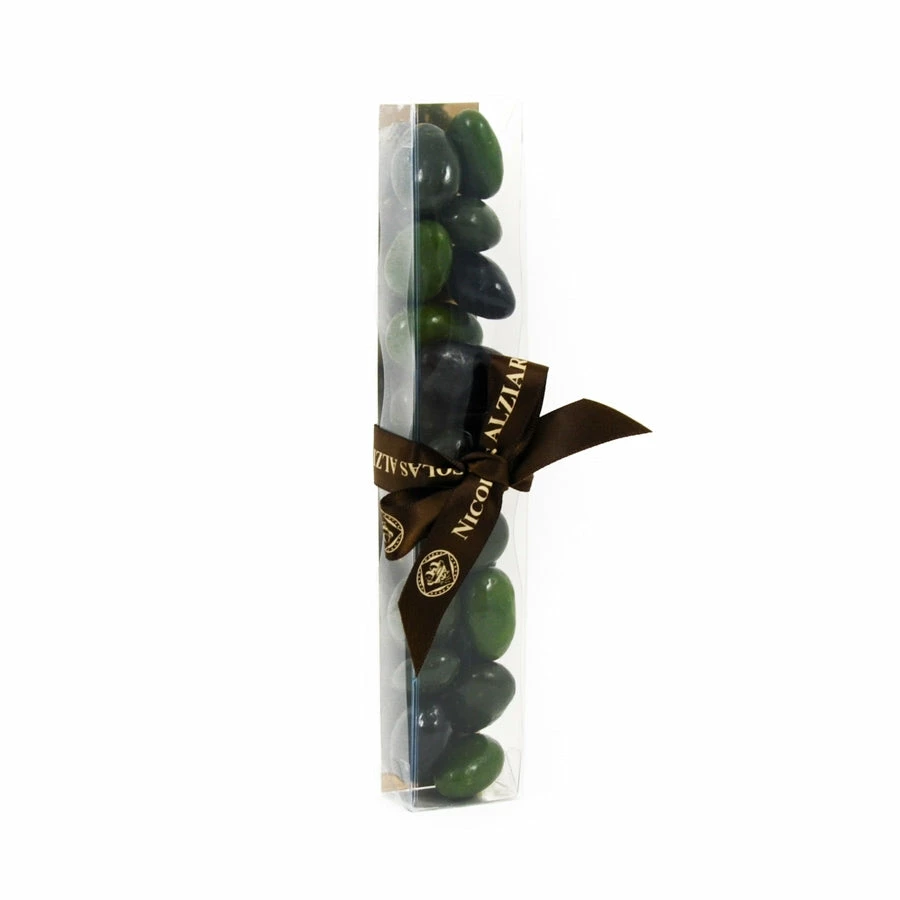 Provence olive-shaped chocolates are a quirky take on plain chocolate-coated almonds. The chocolate coating is cleverly painted to resemble black and green olives!