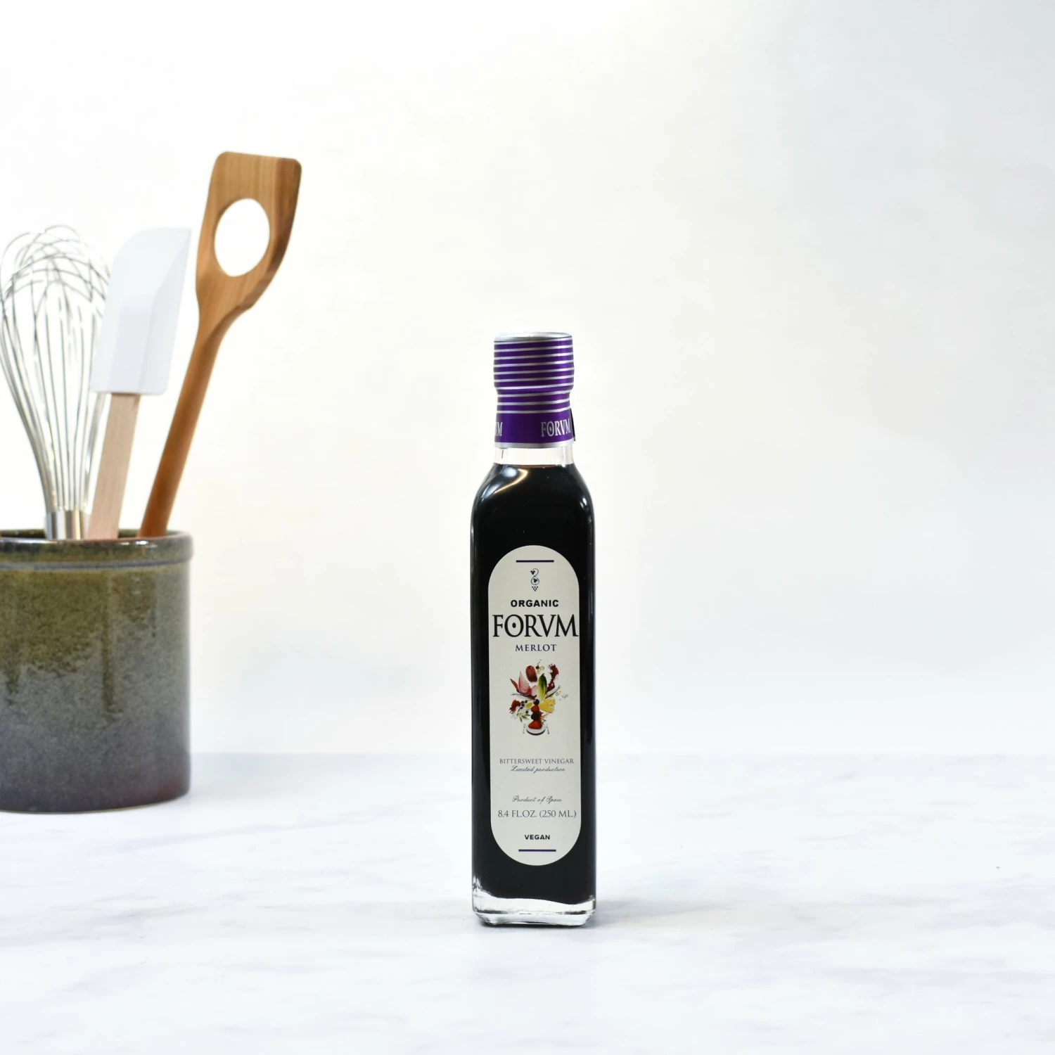 Forum, Forvum or Forvm merlot vinegar is a fruity, bittersweet Catalan vinegar made from young merlot wine. Unlike Forvm’s other vinegars, the merlot vinegar has not been aged in oak casks and contains 35% grape juice, which gives sweeter, more rounded flavours. The intense red-violet hue gives a vibrant touch of colour to salads. The red fruit flavours also work well with desserts – use the vinegar in a sweet reduction and drizzle over fresh fruit salads or red berry cheesecake.