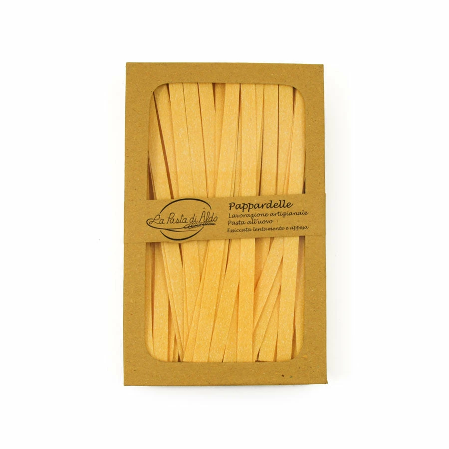 Pasta di Aldo pappardelle egg pasta has a rich and refined flavour – this is one pasta you won’t want to smother with sauce! Serve the wide ribbons simply with a little butter or high quality olive oil and black pepper, to let the flavour of the pasta shine through.
