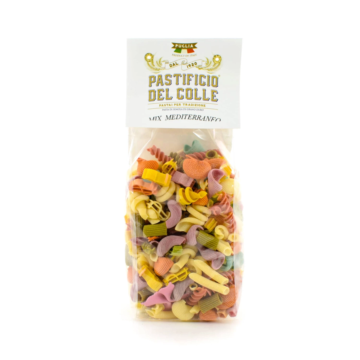Pastificio Del Colle’s “pick and mix” bronze die pasta is an eclectic mix of shapes, colours and sizes. Including bow ties, spirals, ribbons and shells, every mouthful is guaranteed to be different! Use it to make a pasta salad, mixed with tomatoes, olives, torn mozzarella and other favourite Italian flavours.Â