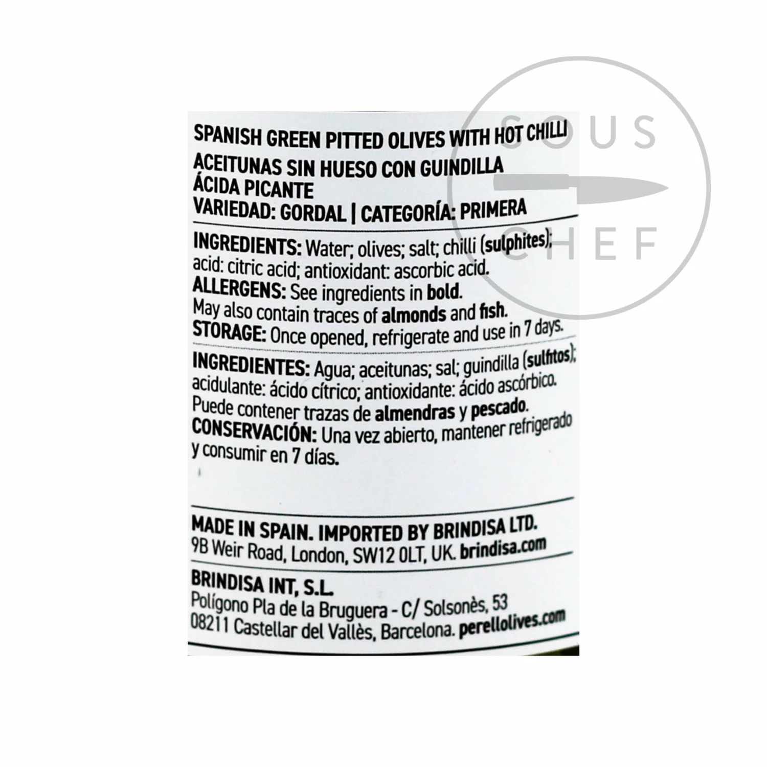 Ingredients: water, olives, chilli (sulphites), salt, flavour enhancers: monosodium glutamate, and disodium ribonucleotides, acid: citric acid, preservative: potassium sorbate.
